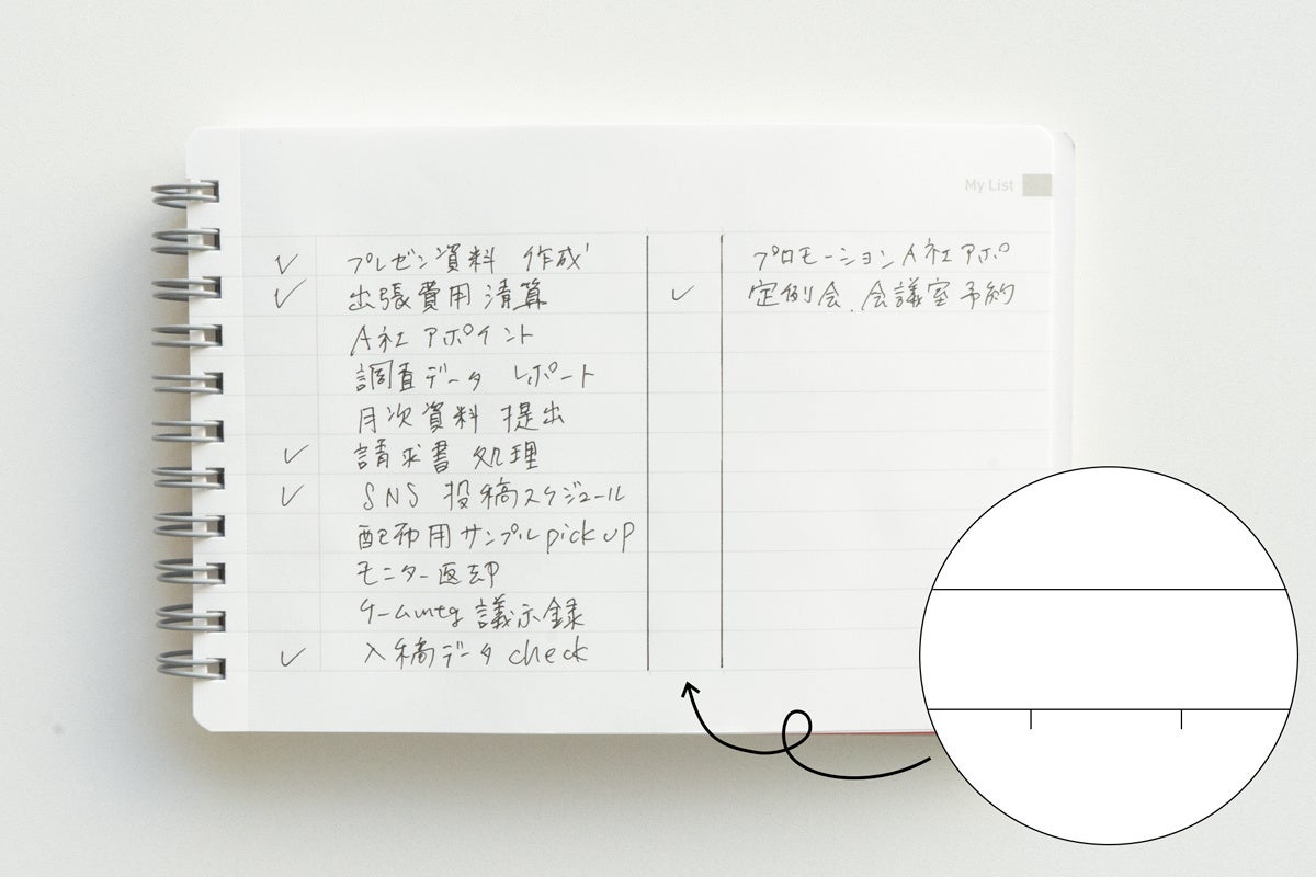 中央にはメモリが付いているので、線を引けばノートを分割したり、項目を増やすことができます。