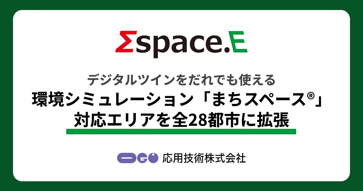 応用技術株式会社(本社:大阪市北区、代表取締役社長:船橋 俊郎、以下 「応用技術」)は、デジタルツインをだれでも使える環境シミュレーション「まちスペース®」の対応エリアを2都市から全28都市へ大幅に拡張しました。まちスペースは国土交通省のPLATEAUデータを活用し、Webブラウザ上で手軽に環境シミュレーションを実行できるサービスです。