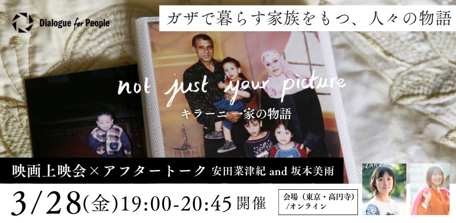 認定NPO法人Dialogue for People(東京都中野区・代表理事:佐藤慧、略称D4P)は、パレスチナ・ガザ地区に暮らす家族を持つ人々の姿を追ったドキュメンタリー映画『Not Just Your Picture キラーニ 一家の物語』の上映会&アフタートークを、3月28日(金)に会場(東京・高円寺)とオンラインでハイブリッド開催いたします。