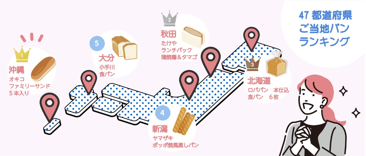 1県のみで販売実績があり、各都道府県別の中で最も購入率が高い商品を代表パンとして抽出し、下記ランキング化しています。1位となった沖縄県のオキコパンのファミリーサンドに続き、2位秋田県のたけや製パンのランチパック蒲焼鶏&タマゴも購入率が20%を超え。その土地でしか買えないご当地パンは旅行などで訪れた際、見つけたら即買いをおすすめしします。