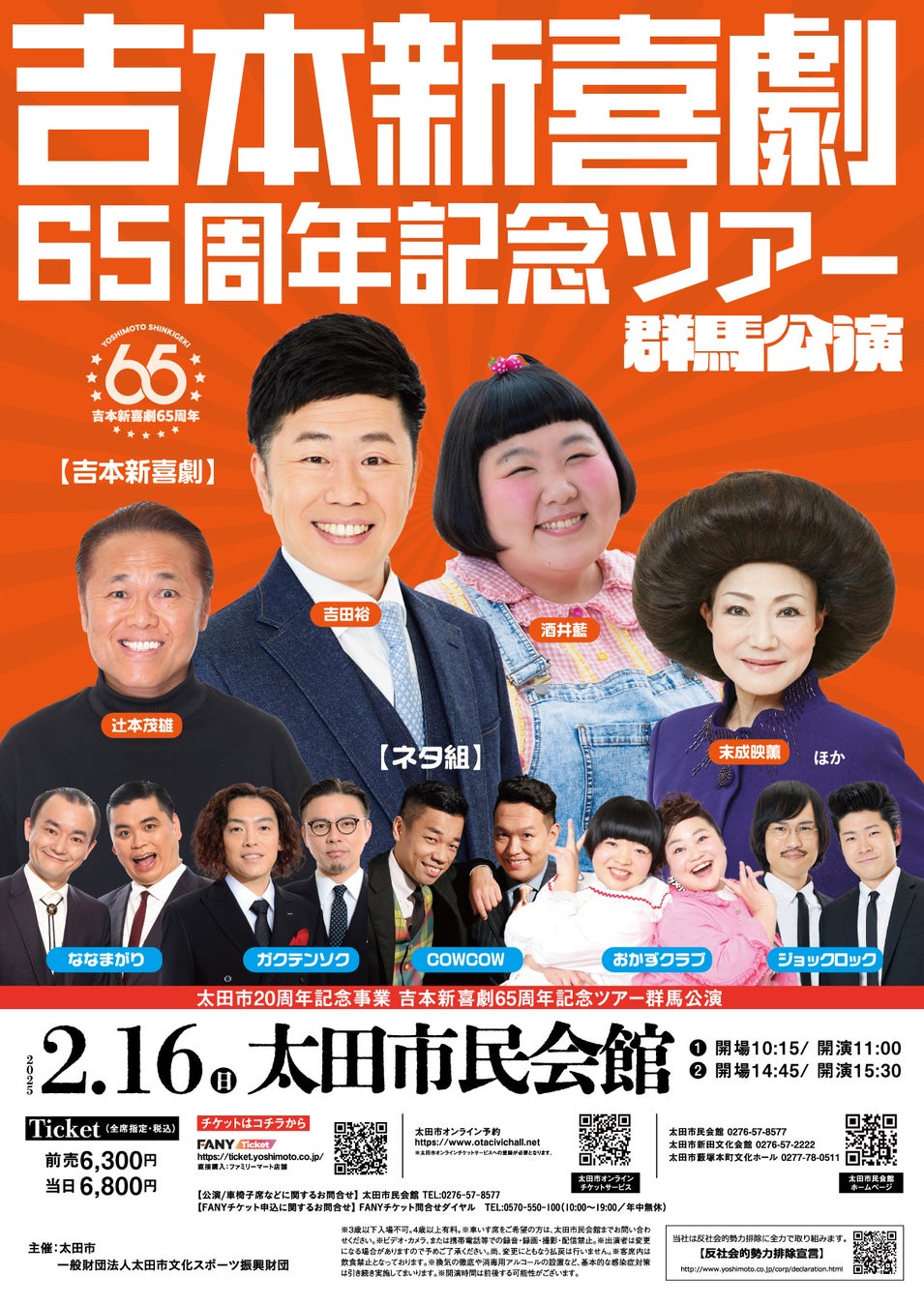ぐんまちゃんがゲスト出演する「吉本新喜劇65周年記念ツアー群馬公演」の詳細やチケット情報は吉本新喜劇ホームページまたは会場となる太田市民会館のホームページをご覧ください。