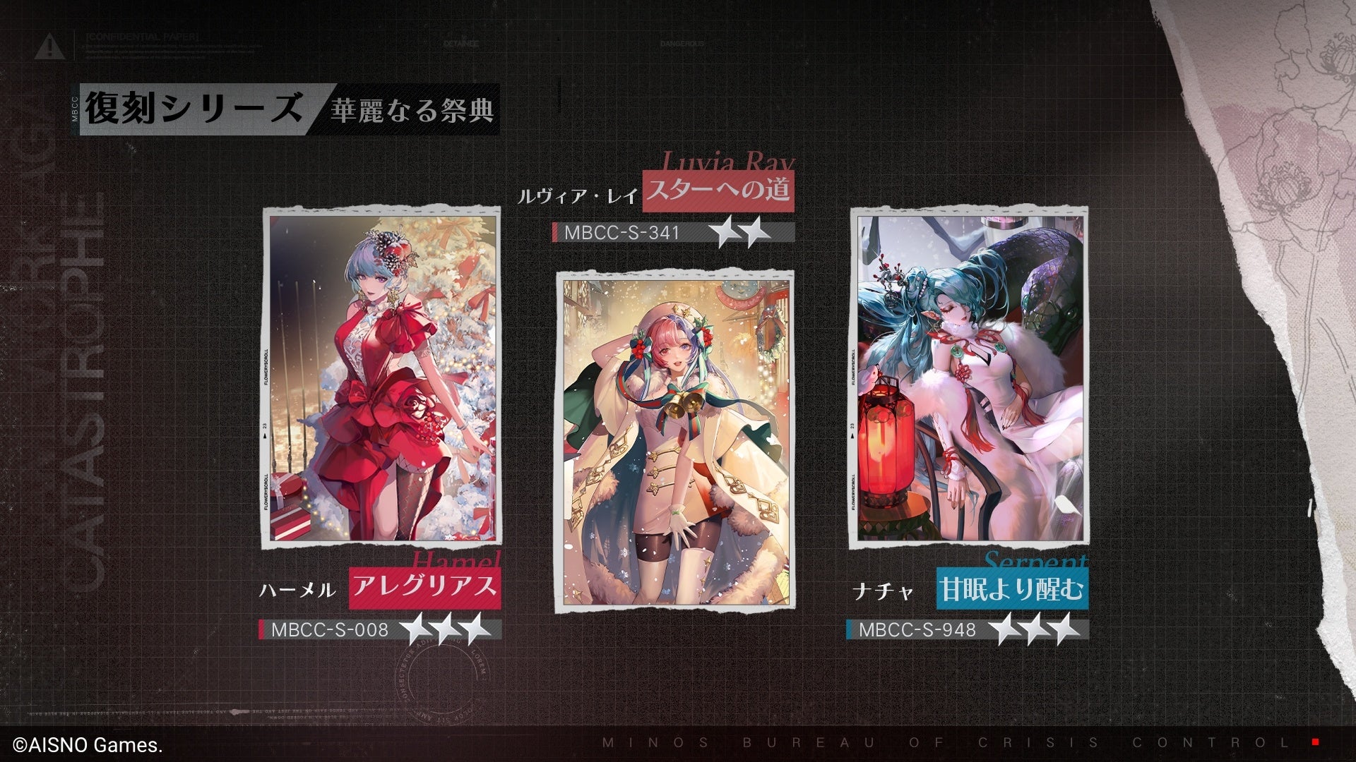 ■ 逮捕詳細:期間中、イベントで新登場するS級コンビクト「コクリコ」、A級コンビクト「クリスティナ」を獲得できます。また、S級コンビクト「コクリコ」、A級コンビクト「クリスティナ」「カワカワ」「テトラ」の獲得確率がUPします!