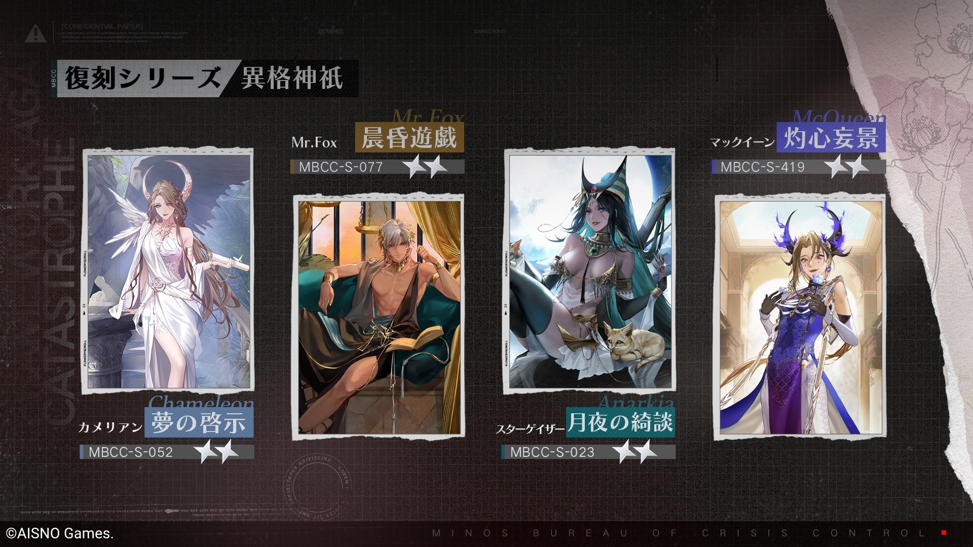 ■ 販売説明:期間中、星2衣装「カメリアン・夢の啓示」「Mr.Fox・晨昏遊戯」「スターゲイザー・月夜の綺談」「マックイーン・灼心妄景」が期間限定で復刻販売されます。