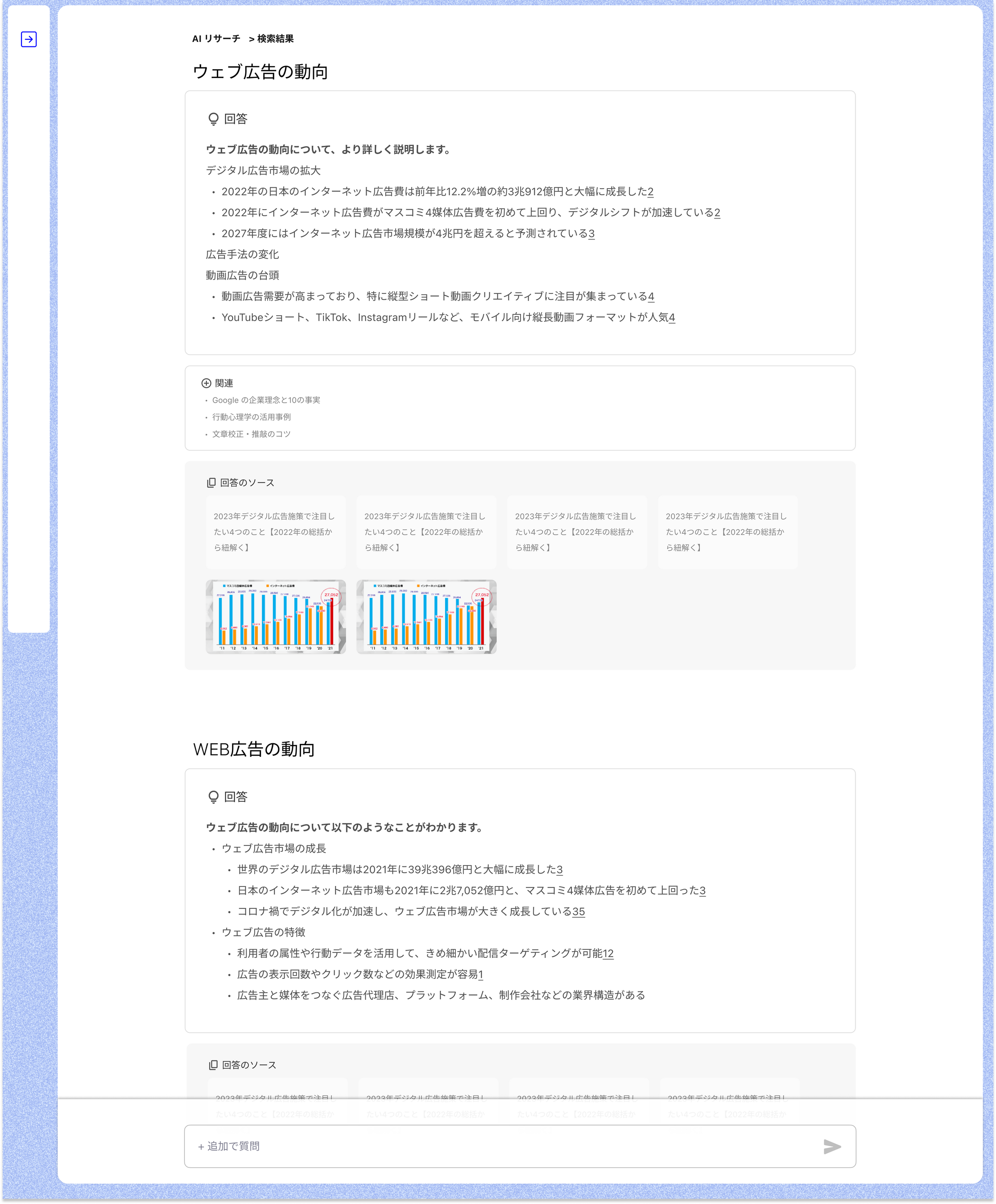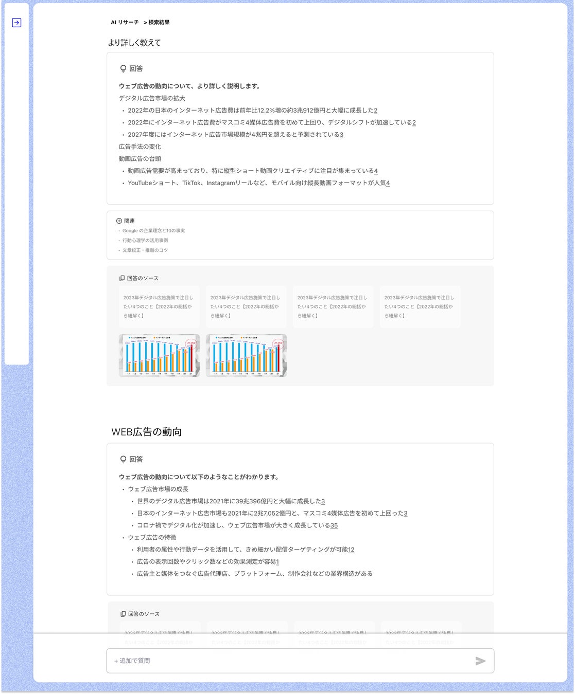 市場調査や競合調査など、参照記事とともに最新・最適な情報を検索しあなたの代わりに内容を要約して回答します。回答に対して質問を続けると欲しい情報をよりブラッシュアップすることが出来、リサーチ業務をより効率的に行うことが可能です。