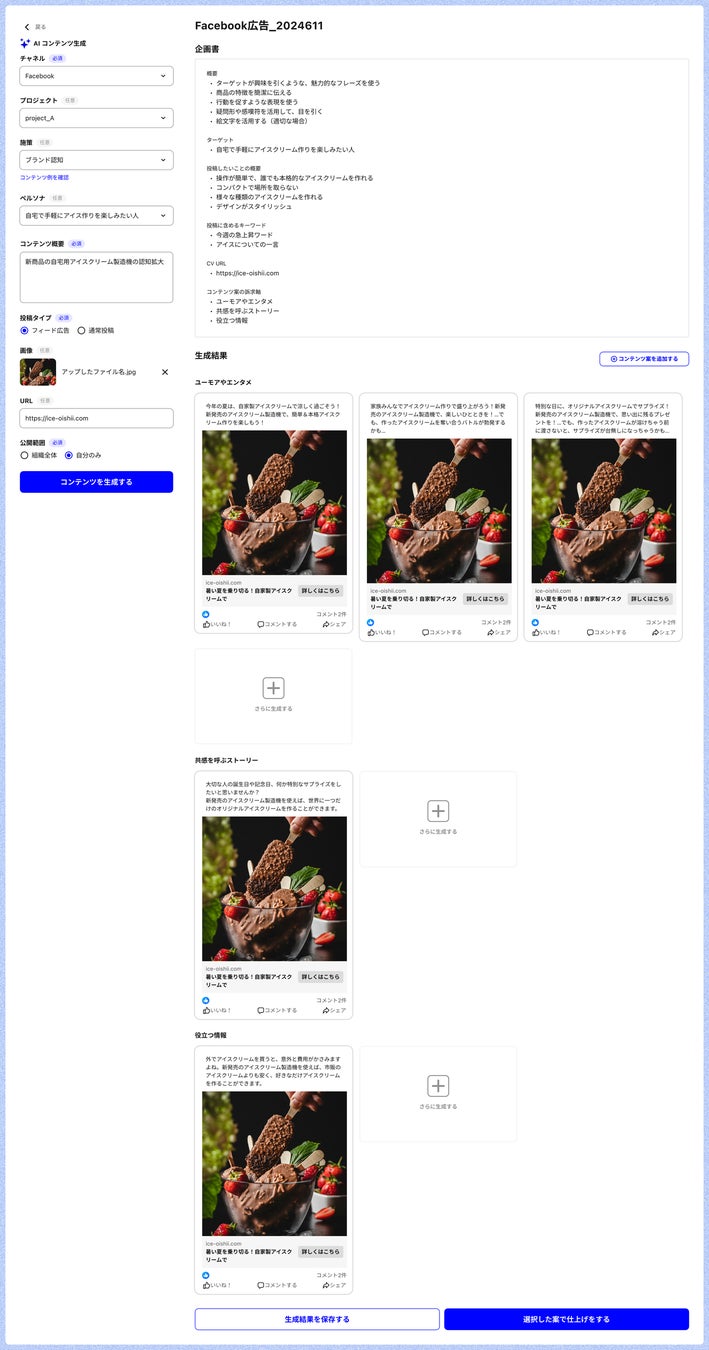Google広告やSNS投稿など、ボタンをクリックし情報を入力するだけで訴求軸ごとにコンテンツが生成されます。気に入るコンテンツがなければ追加で生成することが出来、直接生成内容を編集も可能です。事前に登録したペルソナ・プロジェクト情報・施策情報に基づいて生成されるため、高い品質のコンテンツを瞬時に作成出来ます。