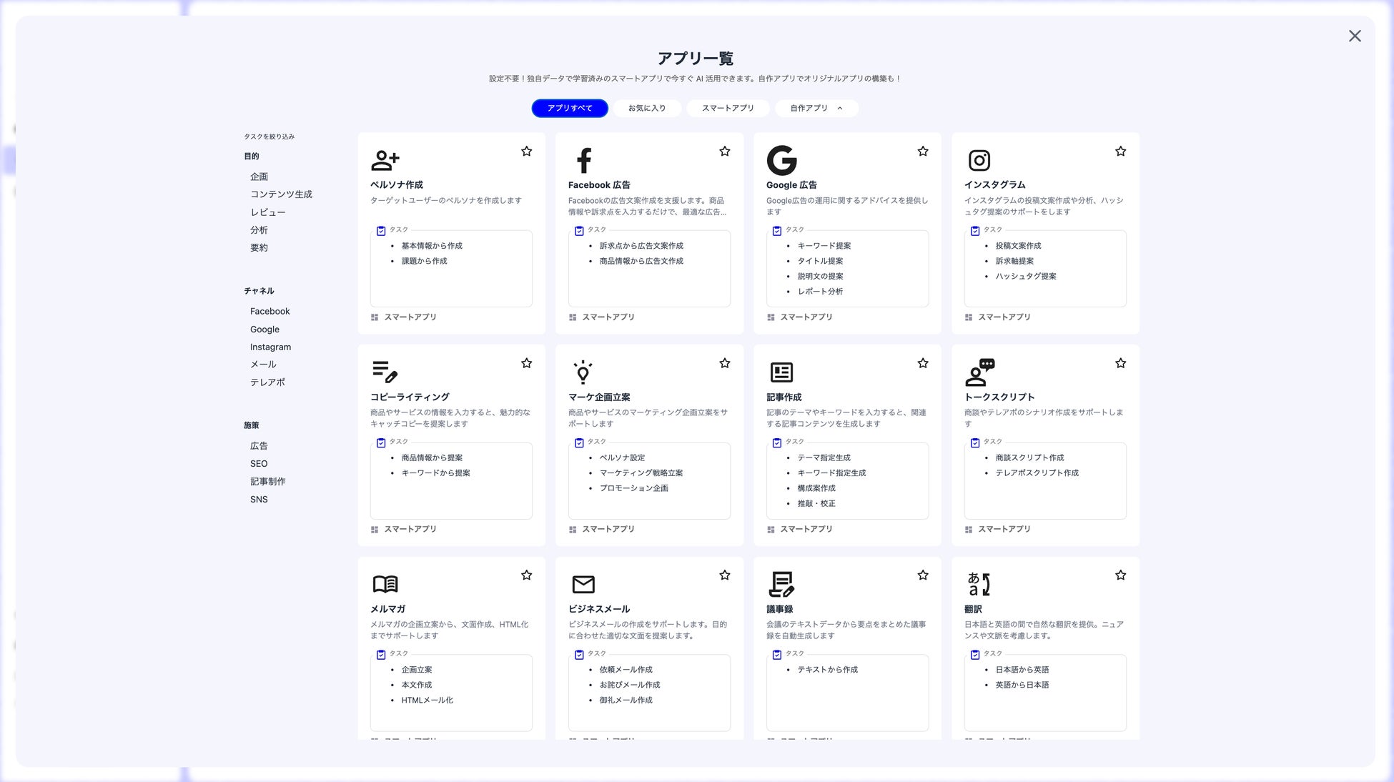 ペルソナ作成/Google広告/Facebook/Instagram/マーケ企画立案/記事作成など、各業務ごとに最適化された12のアプリで、プロンプトなしで欲しい回答結果を得られます。追加でアプリを自作することも出来ます。最新のLLMモデルを各アプリ内で選択し、用途に応じて使い分けが可能です。