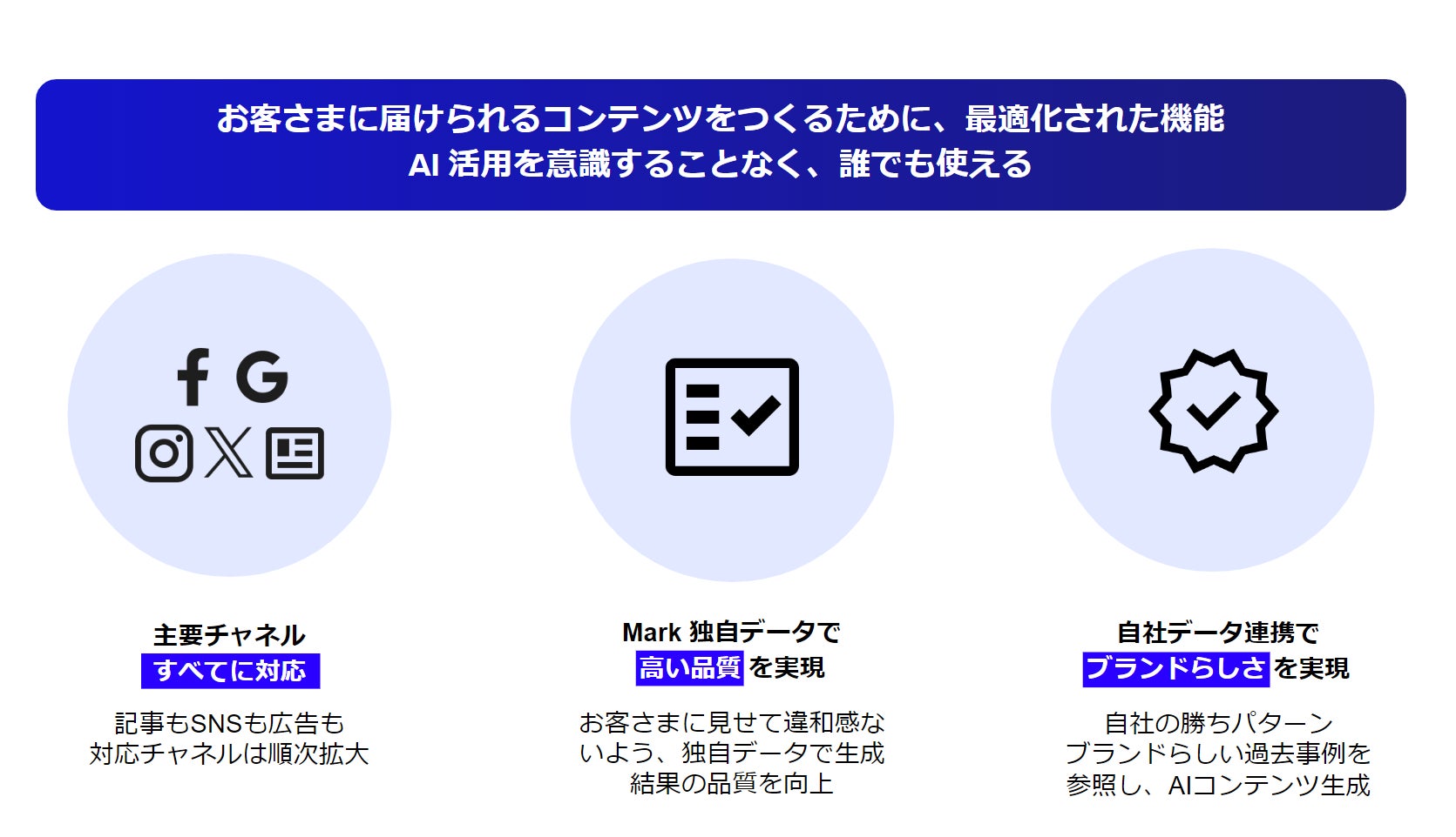 「Mark」は生成AIの技術進化に柔軟に対応し、コンテンツマーケティングに携わる方のより幅広いニーズに応えるべく様々な用途に順応していきます。コンテンツ生成のみならず、画像生成・動画生成・広告配信・データ分析に関わる業務・レポーティング等、多岐に渡る展開を行う予定です。