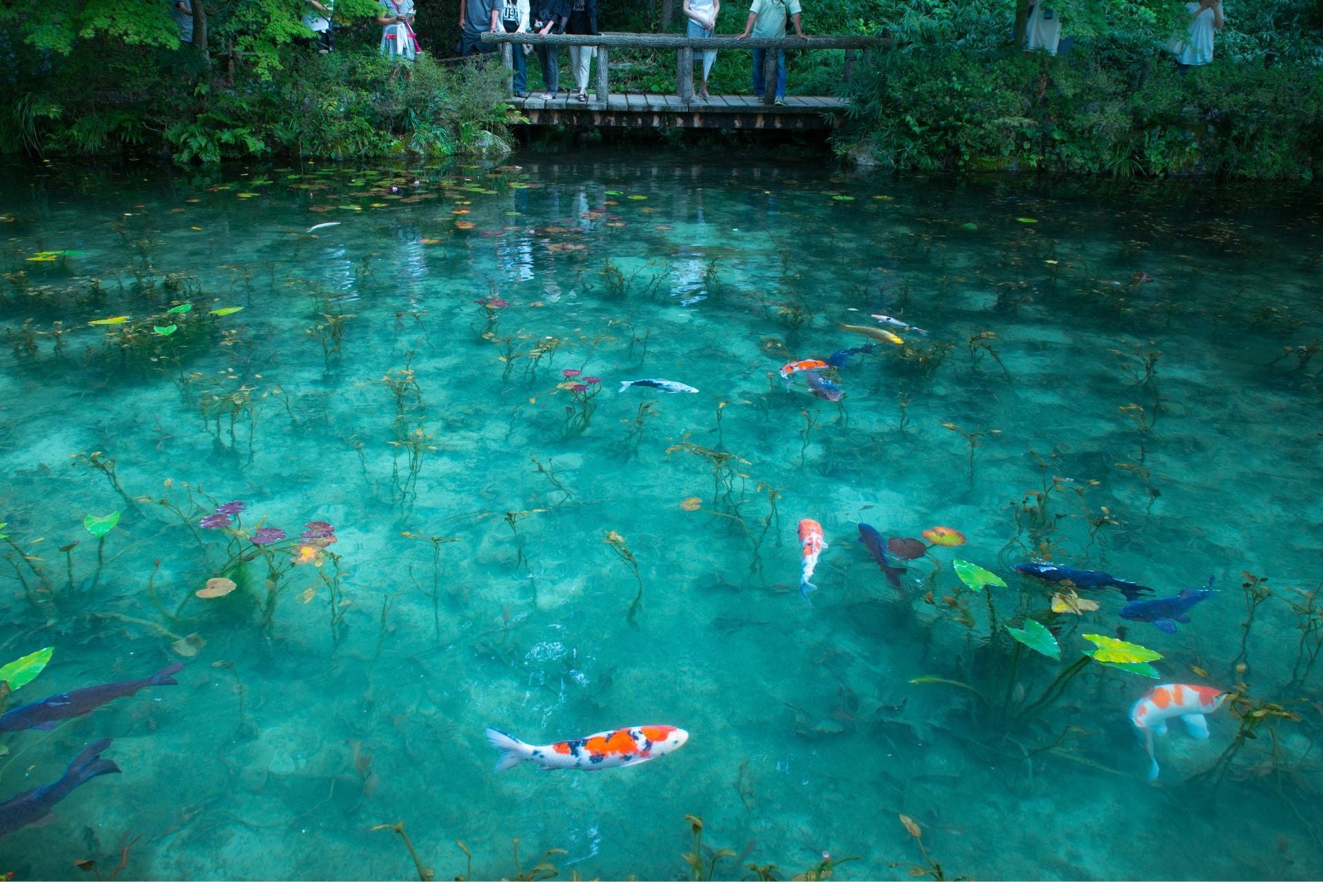 関市板取の根道神社境内にある名もなき池(通称:モネの池)。透明度の高い湧水に咲く睡蓮が絶景。優雅に錦鯉が泳ぐ姿はまるでモネの代表作「睡蓮」のようだとSNSで話題になり、連日多くの方で賑わっています。