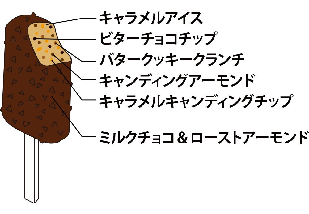 アイスの中にビターチョコチップ、キャンディングアーモンド、キャラメルチップ、クッキークランチを混ぜ込み食感を楽しめるアイスです。