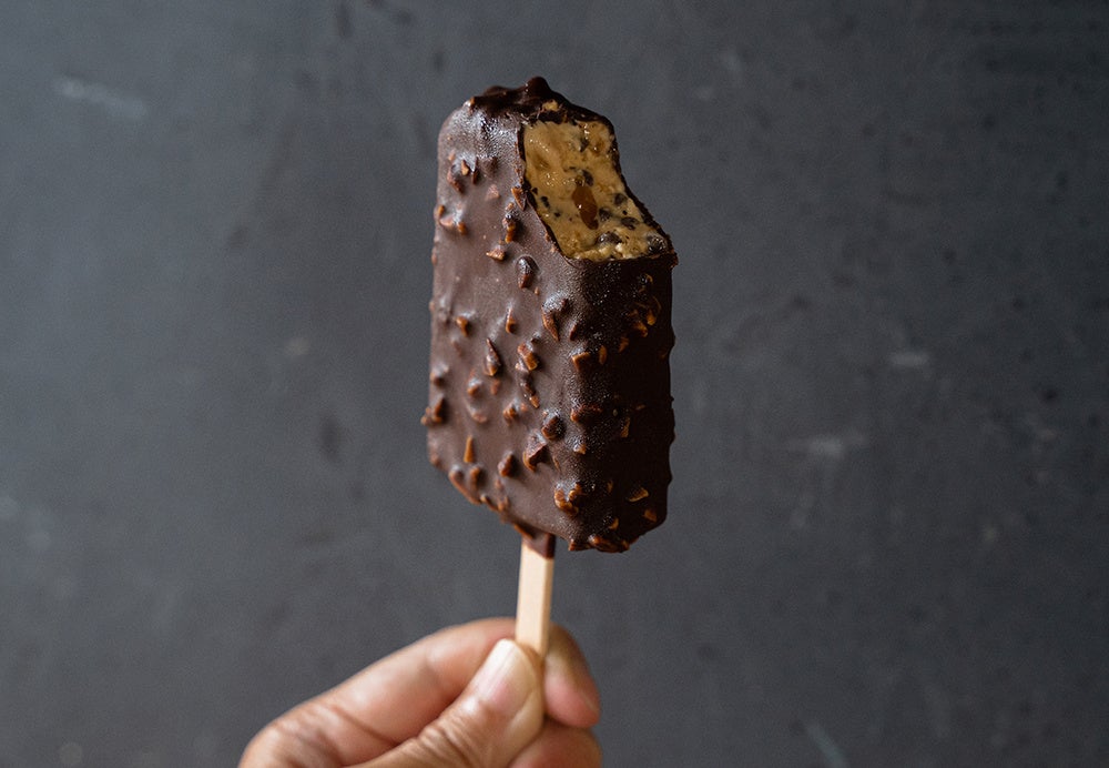 チョコレート好きにはたまらない「N.Y.リッチスカッチサンド&Wチョコレート」をバータイプのアイスに仕立てました。アーモンドスカッチ風アイスに4種類の具材と、2種類のチョコで「N.Y.リッチスカッチサンド&Wチョコレート」の世界観を表現。