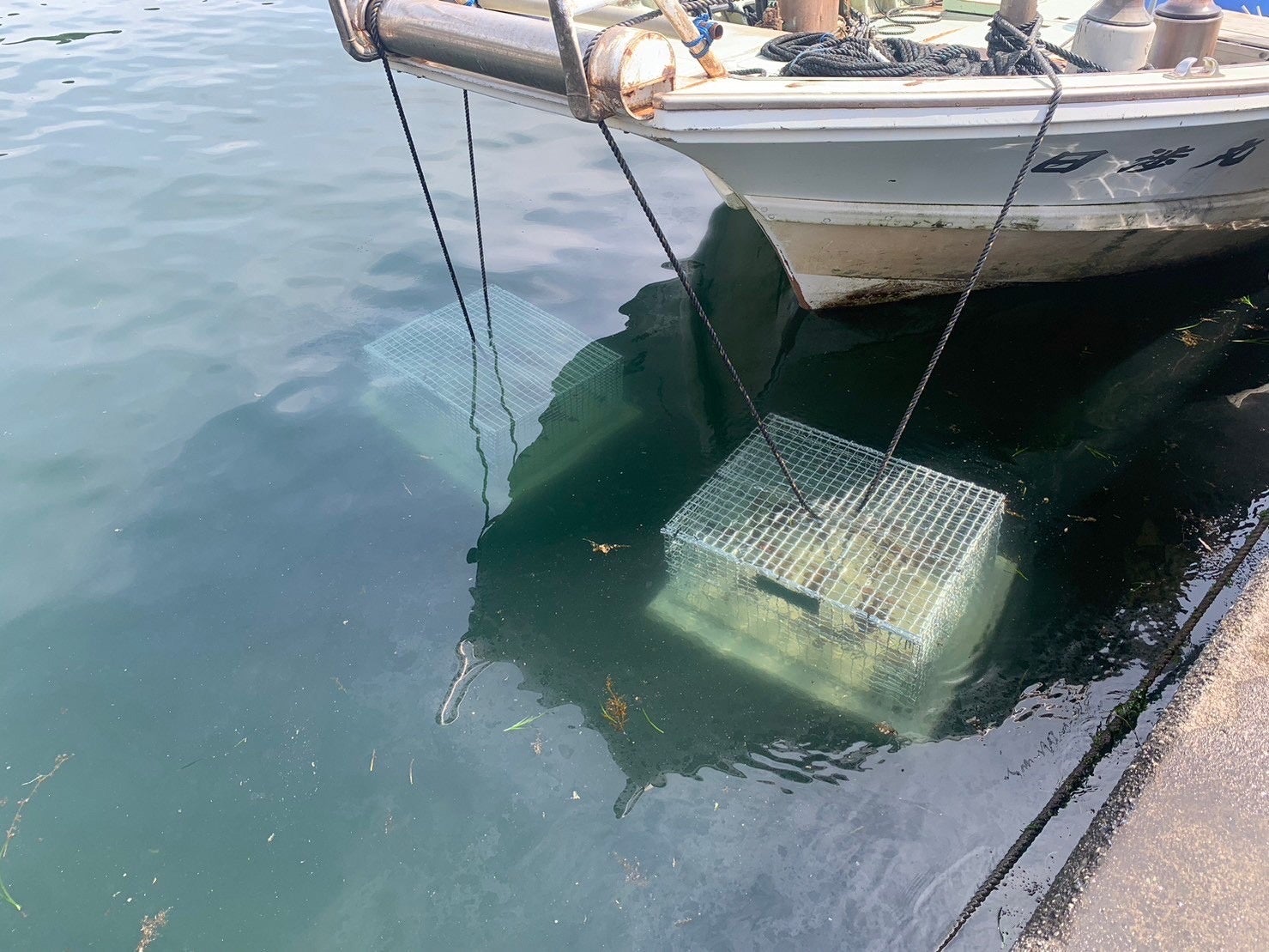 早熟カジメ(通常よりも成熟の早いカジメ)を、食害生物による被害を受けにくい保護網付きの藻場礁に入れ、海底に設置。