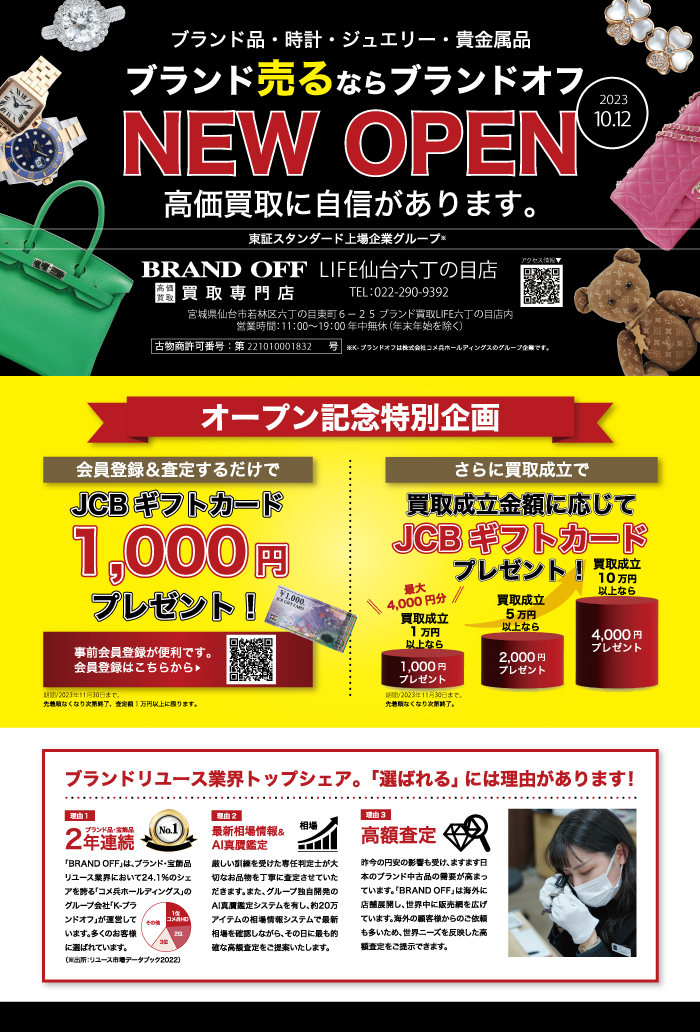 「BRAND OFF 買取専門 LIFE仙台六丁の目店」が宮城県仙台市に10月12日(木)オープン
