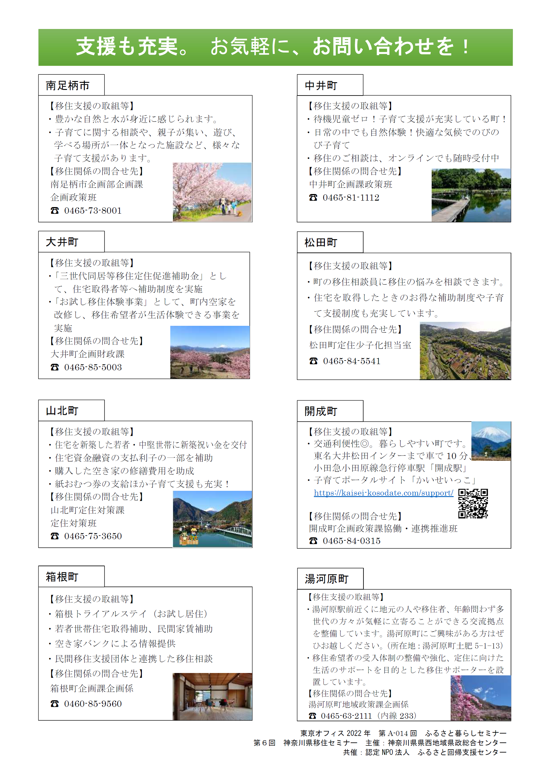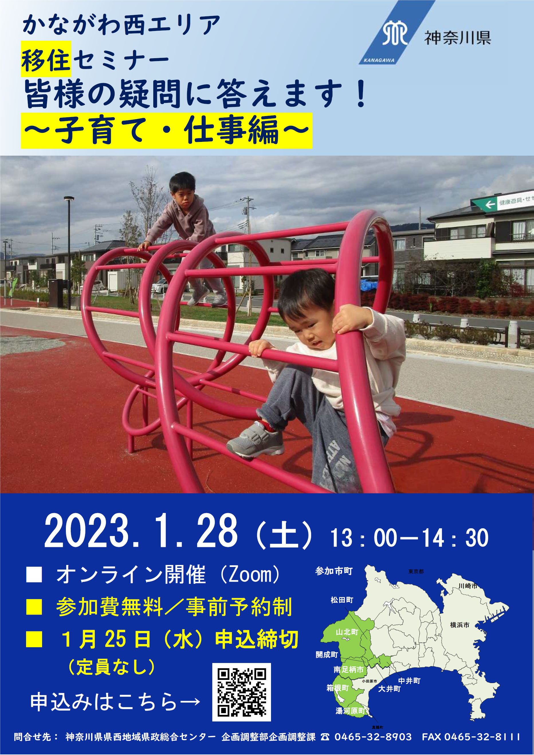 令和4年度第6回神奈川県移住セミナーをオンラインで次のとおり開催します。移住を検討している皆様の子育てや仕事に関する悩みを各市町の職員が直接回答します!移住先としてかながわ西エリア(注釈1)に興味がある方はぜひ御参加ください。