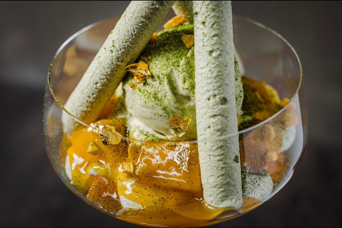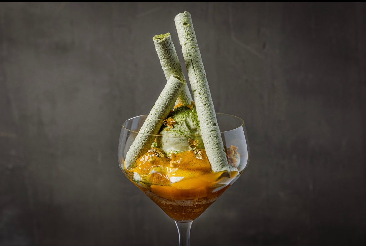 旬が始まる宮崎県産の完熟マンゴーと新茶シーズンを迎える日本茶を合わせたティラミス仕立てのパフェ。