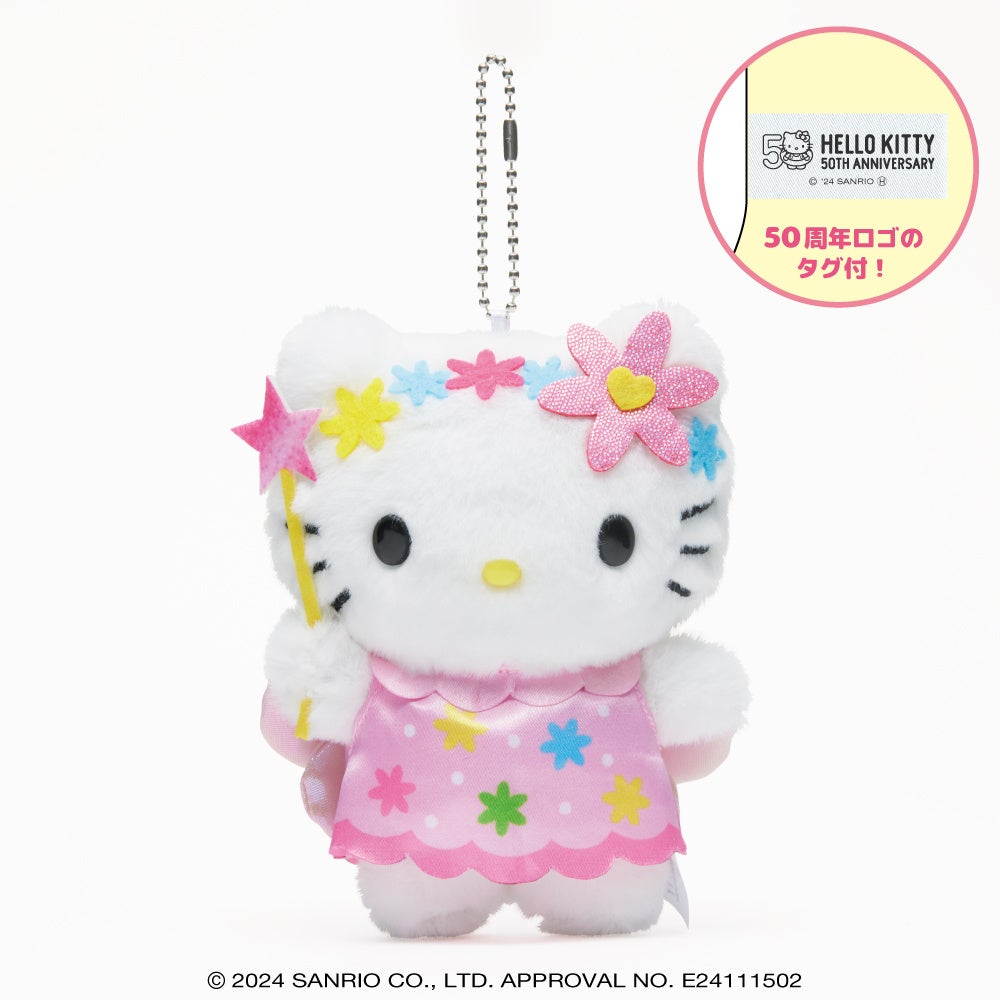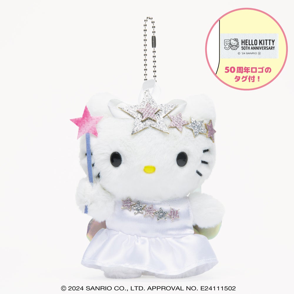 歴代アートをモチーフにしたこのチャームは、ふわふわの手触りに加え、キラキラ輝くリボンやオーロラカラーの羽、50周年を象徴する記念ロゴがプリントされたタグなど、細部までこだわった特別仕様です。バッグやポーチに付けられる手のひらサイズとなっており、いつでもハローキティと一緒にお出かけできます。