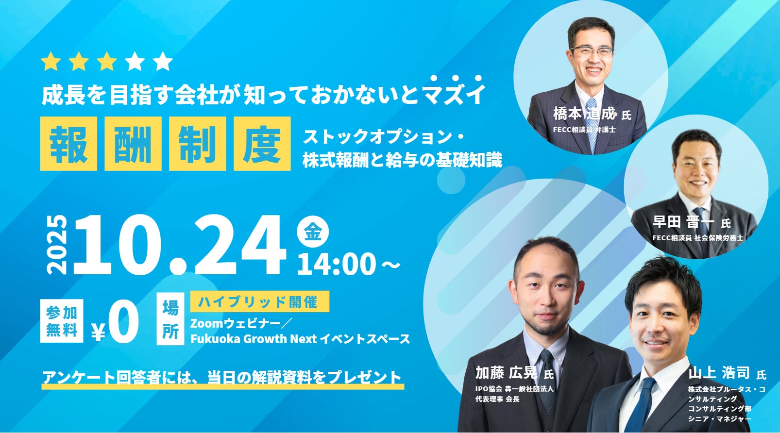 IPOの無限の可能性を唱える「IPO協会 轟」代表の加藤広晃が、10月24日(金)14:00〜Fukuoka Growth Next(福岡市)にて、「成長を目指す会社が知っておかないとまずい報酬制度 ~ストックオプション・株式報酬 制度と人事制度・給与の基礎知識~ セミナー」を開催いたします。なお、本セミナーはオンライン参加も可能です。