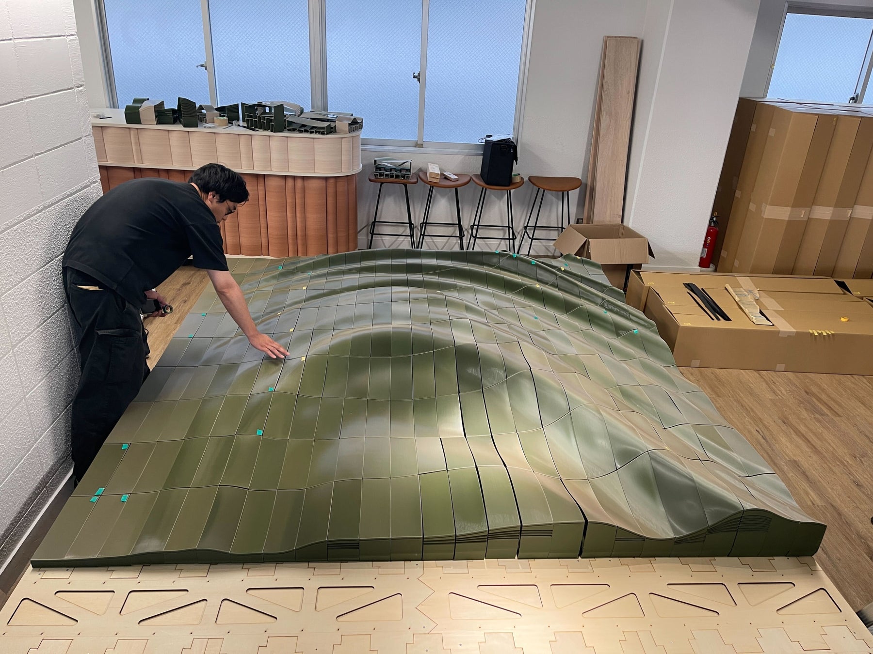 今回の制作でも、サンプルを何度も出力し、フィードバックを重ね、建物や空間のコンセプトを丁寧に可視化することで、その場所だからこそ生まれる一点ものを形にしていきました。 ひとつひとつの要素を丁寧に検証しながら形を見つけていくプロセスは、“実験の延長線上に完成がある”という大日方の制作姿勢を体現しています。