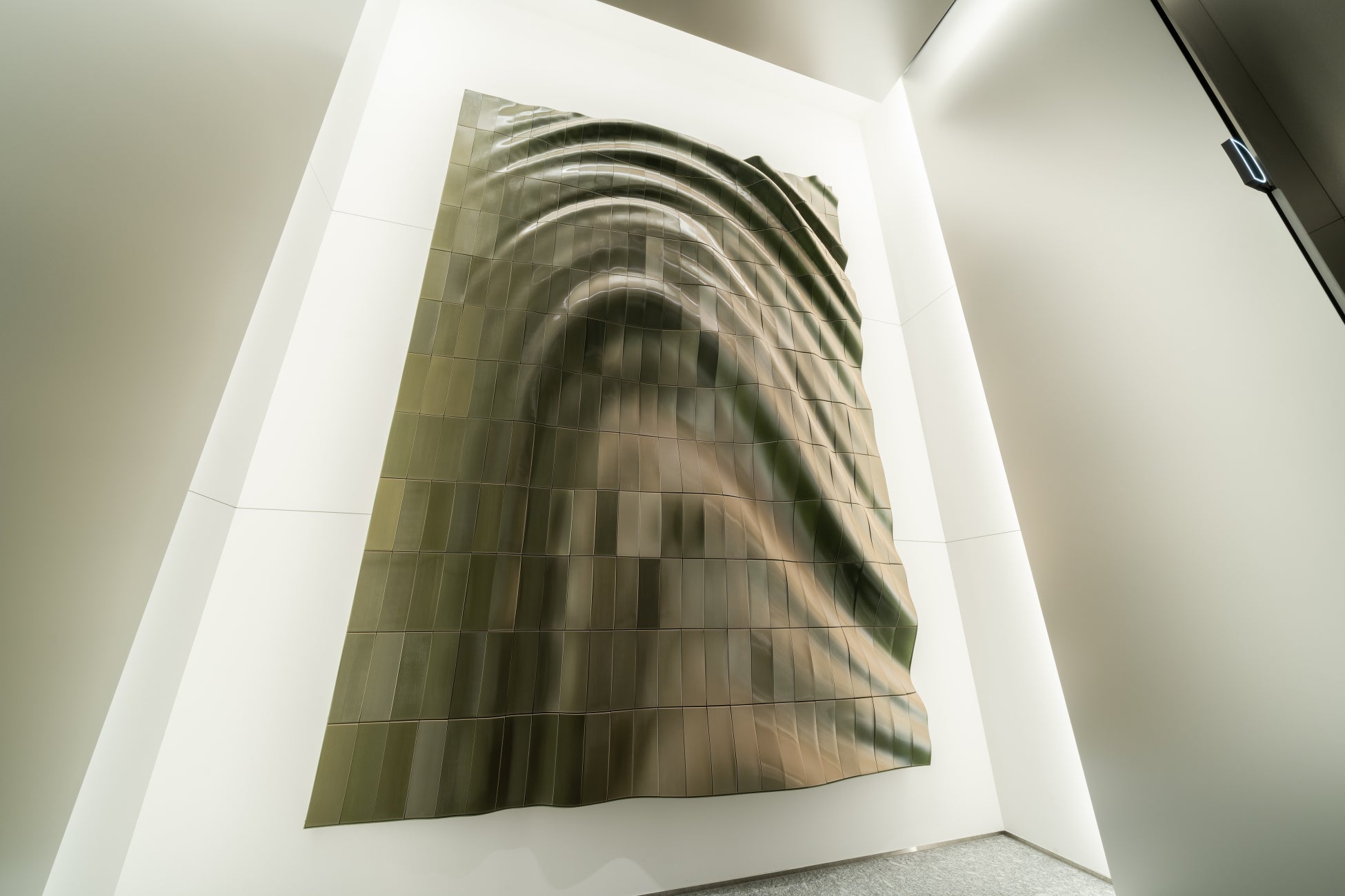 「Whispering Pulse」では、透明材を含む三色の樹脂を同時に積層することで、見る角度や光の当たり方によって色が変化する壁面を作り出しています。ビルを訪れるたびに異なる印象を与え、まるで室内にいながら自然の変化を鑑賞しているような体験をもたらします。彫刻的な立体感と、積層によって生まれる繊細な表情が共存するその造形は、積彩が長年続けてきた研究の積み重ねから生まれたものです。