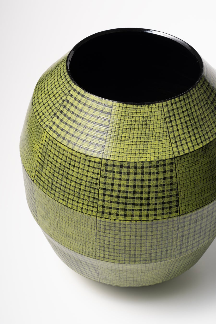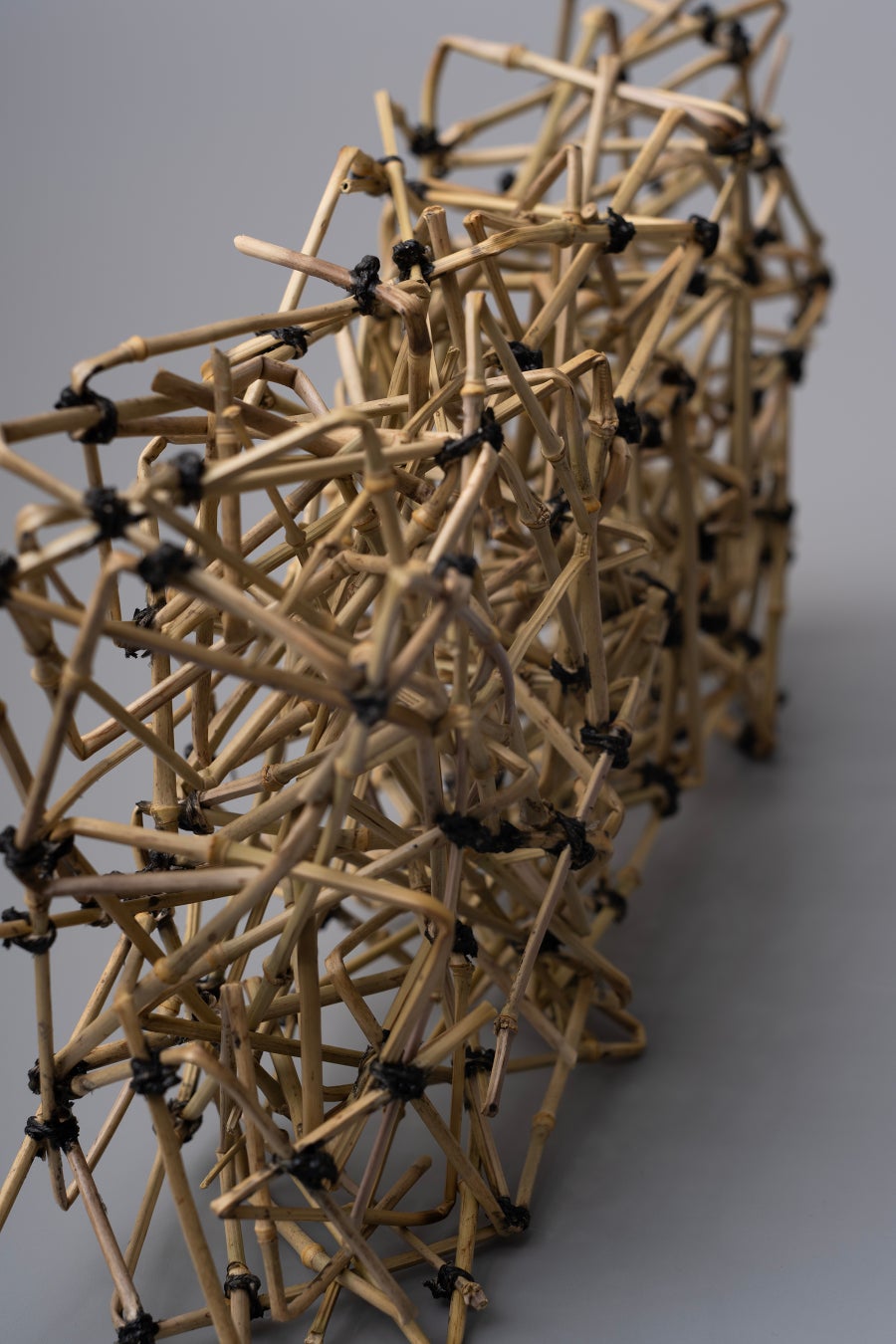 Okame-sasa, hemp, charcoal, gelatinous glue / Heat and bend, Interlocked and connected