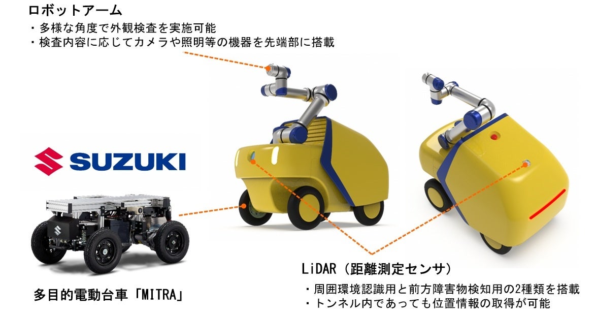 スズキが開発中の多目的電動台車「MITRA(注2)」を鉄道業界で初めて採用し、段差のある場所や砂利敷きの箇所のような不整地走行に対応。また、ロボットアーム等各種部品を搭載。