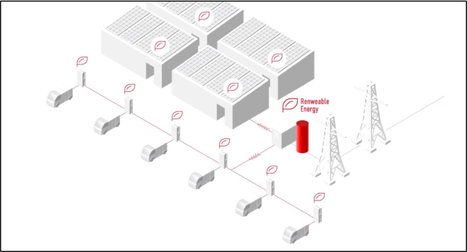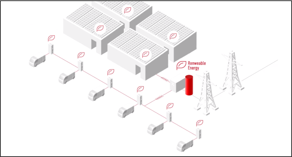 日本政府は、2030 年度において温室効果ガスを 2013 年度比で 46%削減し、2050 年までに CO2 の排出量を実質ゼロにすることを目指しています。物流トラックやタクシー、 バスなどの商用車として電気自動車を運用する場合、日中の営業時間は走行し、夜間は営業所 で充電することが一般的です。しかし、日本では夜間の 8 割以上の電力が火力発電によって供 給されているため、この運用では完全な商用車のゼロエミッション化を実現することはできま せん。ここで「Hypercharger for Fleet」は、昼間に太陽光などにより発電された再生可能エ ネルギーを蓄電池に貯め、夜間の EV 充電に活用できます。このように使うタイミングを選べ ない再生可能エネルギーを溜め、必要な時に効率的に商用車で使うことで、お客様のビジネス のカーボン・フットプリントを削減し、ゼロ・エミッション化の実現を手助けします。