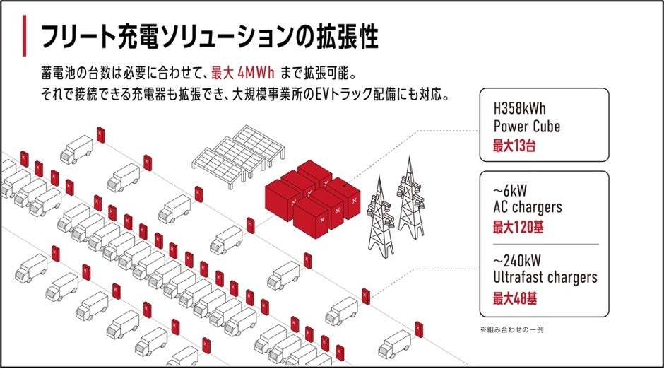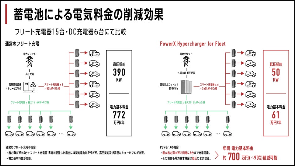 「Hypercharger for Fleet」は、トラック、バス、タクシー等の商用 EV 車両の運行計 画や電池容量に基づき、最適な充電計画を自動的に作成する、スマートな充電ソリューション です。蓄電池を搭載しているため、オンサイト・オフサイト再生可能エネルギー電源を活用で き非常時の BCP 電源としての利用も可能です。また、蓄電池は低圧電力契約での接続が可能 なため、設置ハードルが低くなり大幅のコスト削減が可能です、営業所やトラックデポだけで はなく、ホテルや商業施設への導入も可能です。さらに、フリート最適充電機能と組み合わせ ることにより、同時により多くの台数を充電できます。蓄電池の台数も最大 4MWh まで拡張 可能で、接続できる充電器をさらに増やすことで、大規模事業所の EV トラック配備にも対応 できます。「Hypercharger for Fleet」は、当社の徳島工場「PowerX Tokushima Base」 で自社生産され、制御ソフトウェアも日本国内で開発・制御されます。