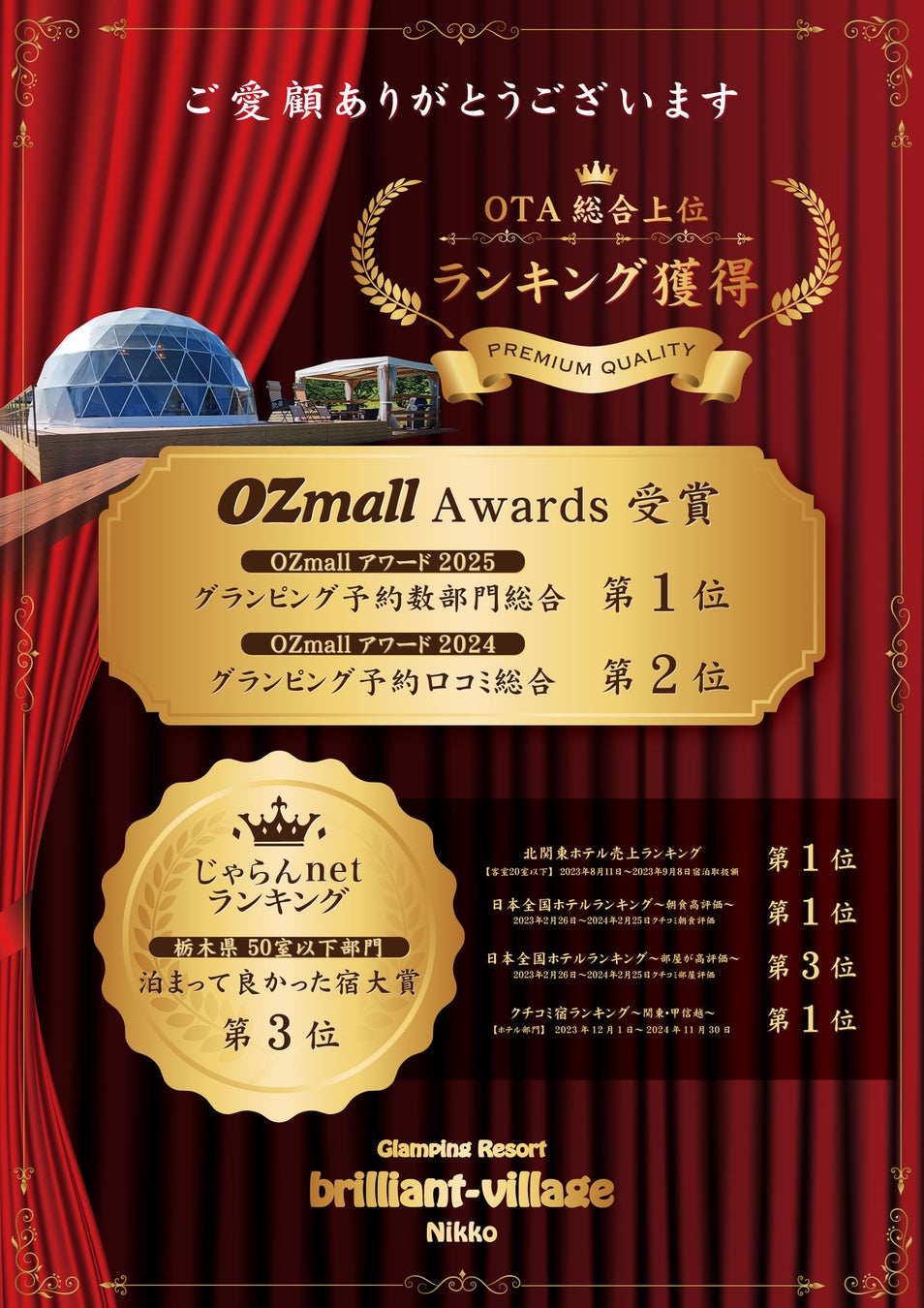 オズモールアワードは、毎年恒例となるイベントで、読者が実際に体験してよかった施設を選出するランキングです。広々としたドーム型テントや日光の自然豊かな環境でのグランピング施設が、多くの方に受け入れられ、ご満足いただけた証です。