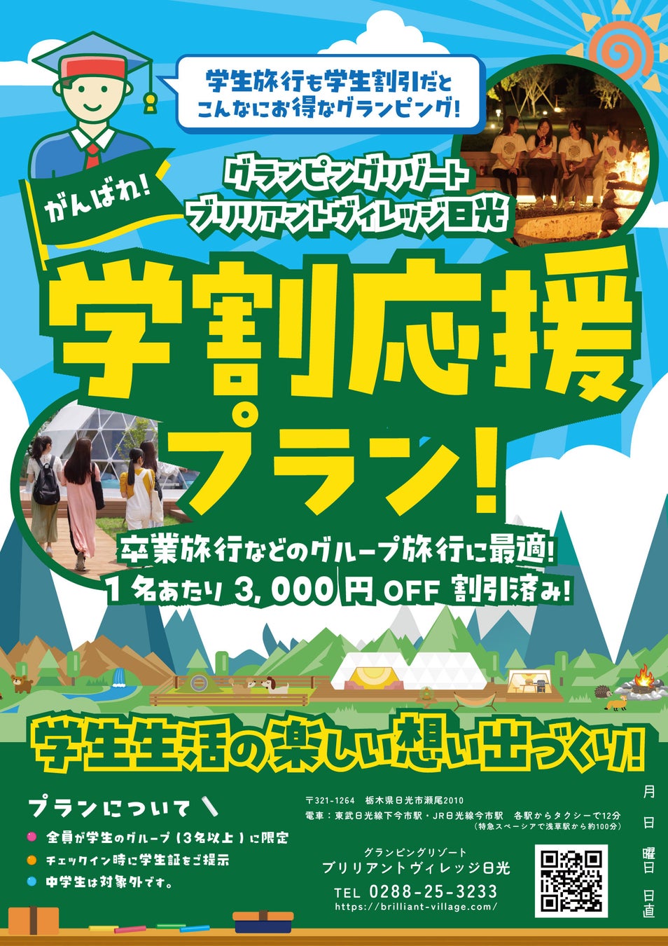 株式会社太平(本社:埼玉県北葛飾郡、代表取締役社長:平子 一郎)が運営するグランピングリゾート ブリリアントヴィレッジ日光は、学生の皆さんを対象とした「学割応援プラン」を期間限定でご提供いたします。