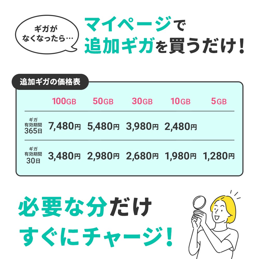 ・使わない月があってもギガを無駄にしない365日の有効期限はそのままに、ギガを多く使う方には有効期間30日の格安追加データも取り扱いを開始!