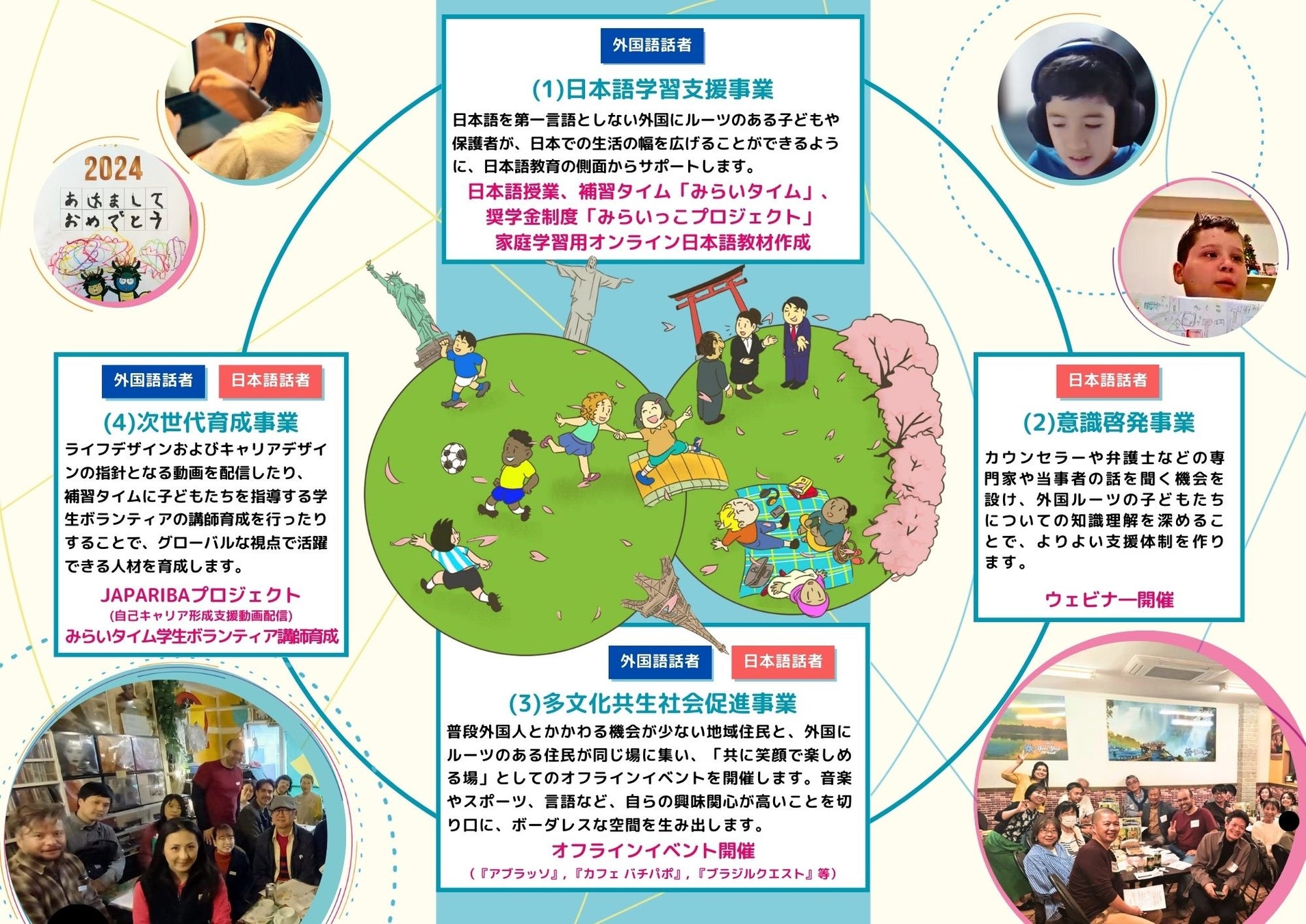 ブラジル人留学生・定住ブラジル人青少年・ブラジルで生活したことのある帰国子女などが一緒になって企画運営を進めていく中で、自分のアイデンティティー・興味関心・強みなどと向き合う機会を作ります。