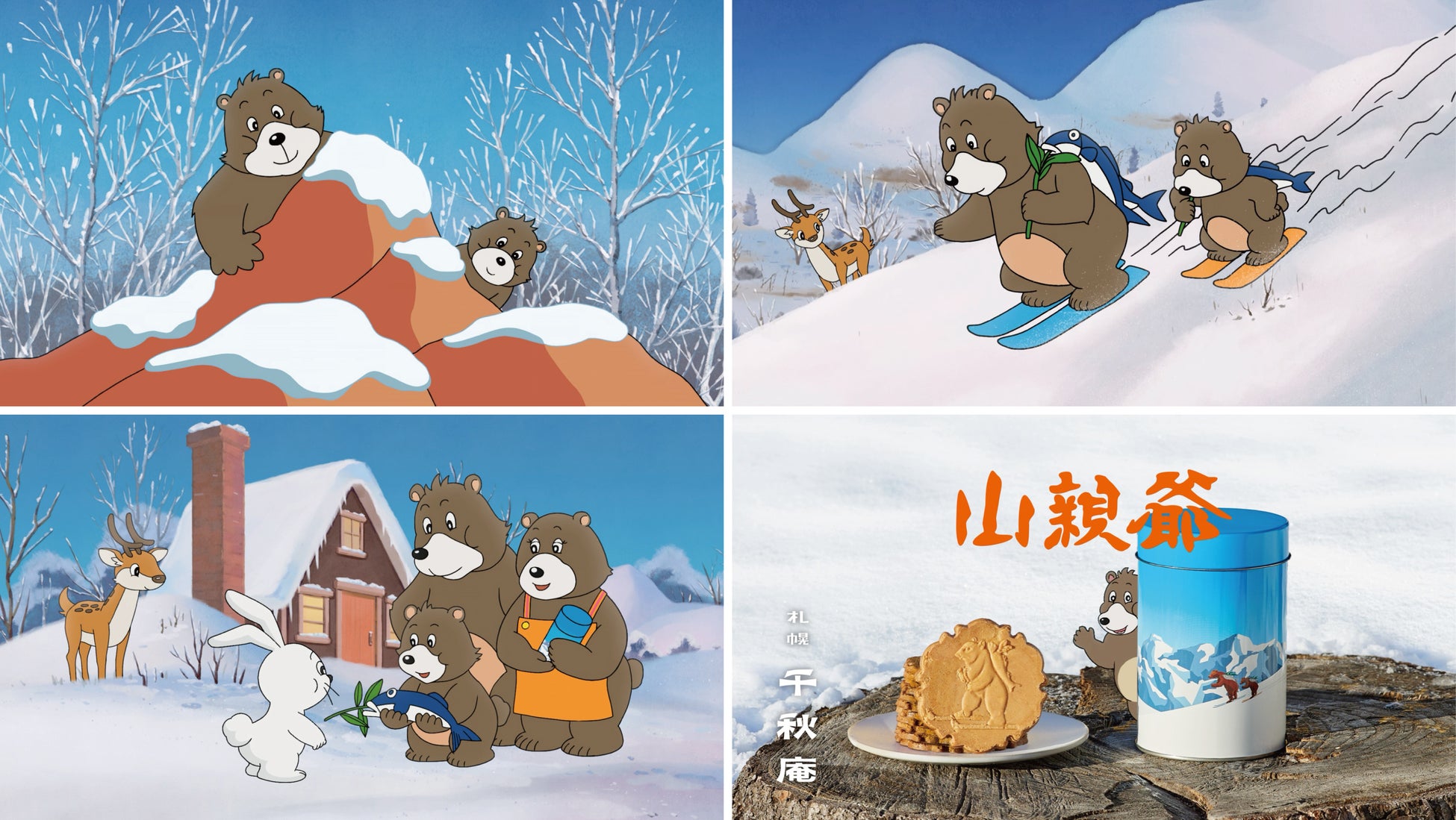 「♪出てきた、出てきた山親爺♪笹の葉かついで鮭(シャケ)しょって スキーにのった山親爺♪(札幌)千秋庵の山親爺♪」というポップな歌詞とメロディーにのせて、かわいい熊の親子が登場します。川で鮭を獲って家に持ち帰り、遊びに来たウサギに、お母さん熊が焼いた山親爺と、川で獲った鮭をプレゼントするという微笑ましいストーリーです。