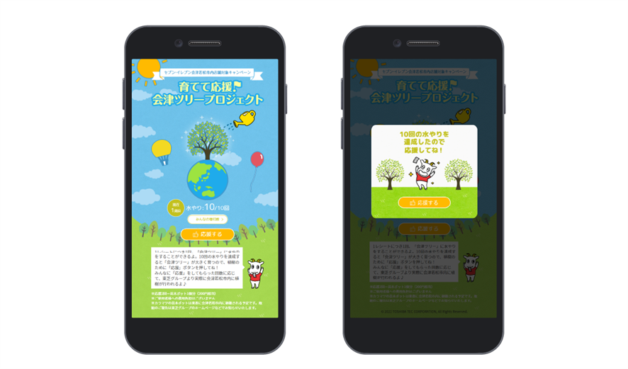 福島県会津若松市内のセブン‐イレブン店舗にて「スマートレシート®」を利用してお買い物をすると、削減した1レシートにつき1口を獲得できます。獲得した口数分「スマートレシートⓇ」アプリ内キャンペーンページ内に表示される「会津ツリー」に水やりをすることでツリーが育ち、10回の水やりでツリーの成長を達成するごとに1回、「応援」ボタンを押すことができる仕組みです。