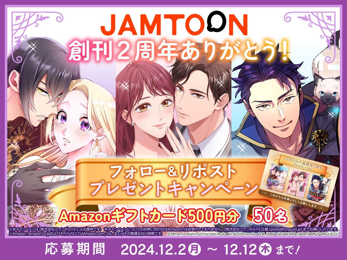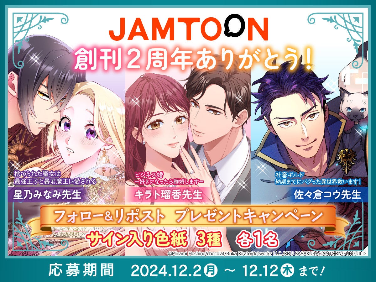 株式会社ファンギルド(本社:東京都新宿区、代表取締役社長:梅木読子)は、タテ読みフルカラー漫画レーベル「JAMTOON(ジャムトゥーン)」の創刊2周年を記念し、編集部公式Xにて人気作品の作家サイン色紙やドラマ「ビジネス婚」DVDBOXなどが当たる2大キャンペーンを実施いたします。