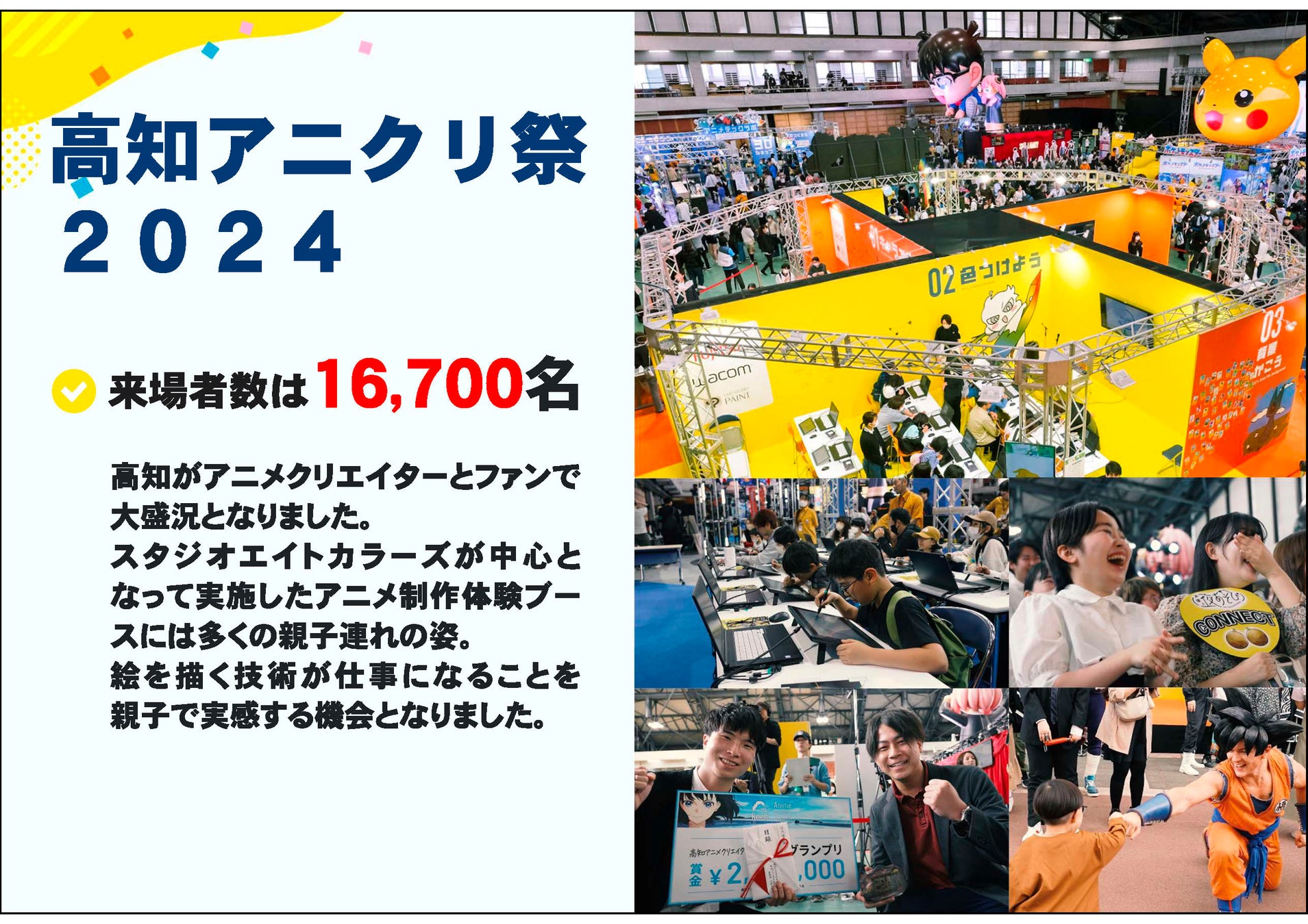 2024年4月に初開催となった高知アニクリ祭2024には1万6,700人もの来場者にお集まりいただき、高知がアニメクリエイターとファンで大盛況となりました。高知のアニメ企業スタジオエイトカラーズと吉本3Dファクトリーが中心となって実施したアニメ・3D制作体験ブースには多くの親子連れの姿も。絵を描く技術が仕事になることを親子で実感する機会となりました。
