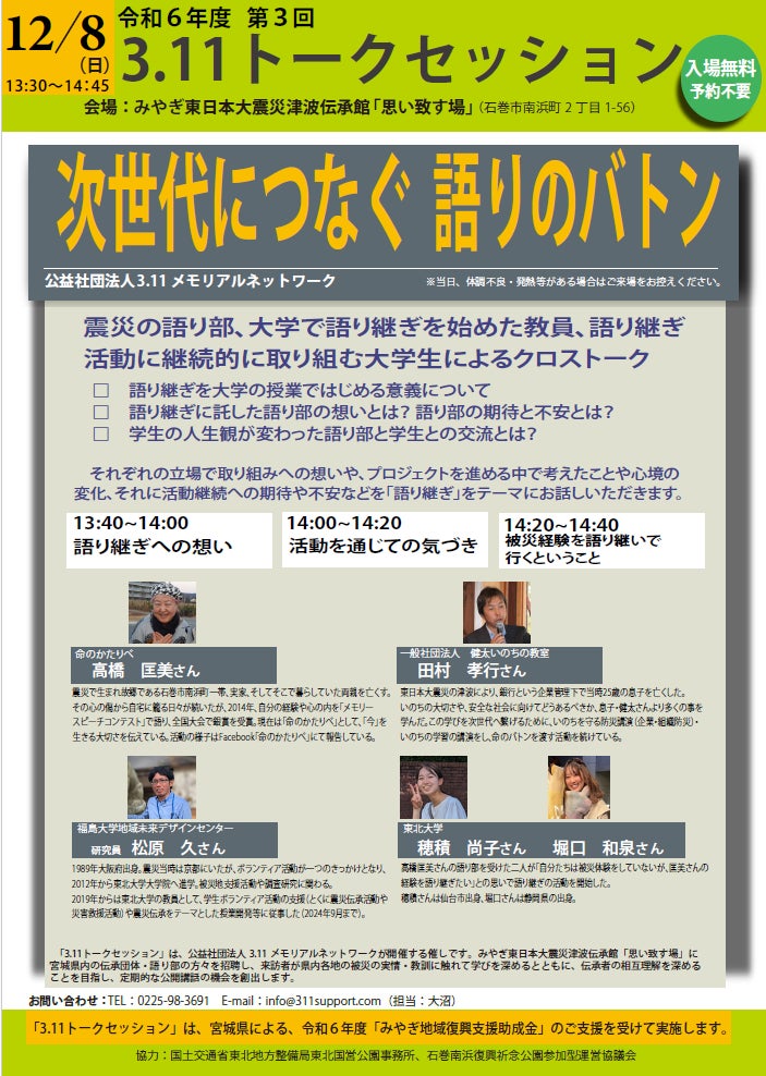 3.11トークセッション(旧 県内語り部プロジェクト)は、公益社団法人3.11メモリアルネットワークが開催する催しです。令和6年度に6回、複数の語り手によるトークセッションを開催予定で、12月8日はその第3回目です。宮城県内の伝承団体・語り部の方々を招聘し、来訪者が県内各地の被災の実情・教訓に触れて学びを深めるとともに、伝承者の相互理解を深めることを目指し、定期的な公開講話の機会を設けています。