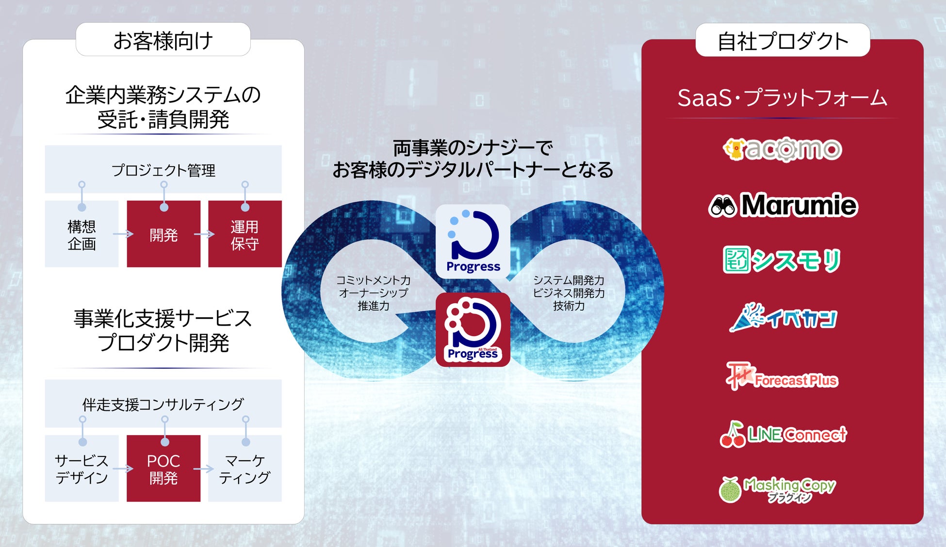 プログレスグループの事業において、PATは日本本社と連携し、システム開発およびグループプロダクトの設計・開発・運用保守を行います。
