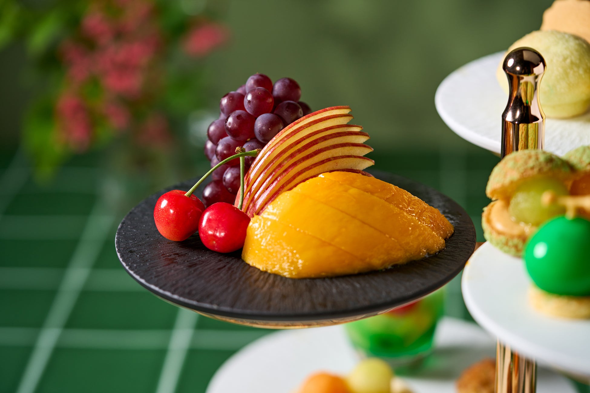 色とりどりの旬のフルーツが、ピンクゴールドに輝くスタイリッシュなスタンドを、みずみずしく、そして華やかに彩ります。