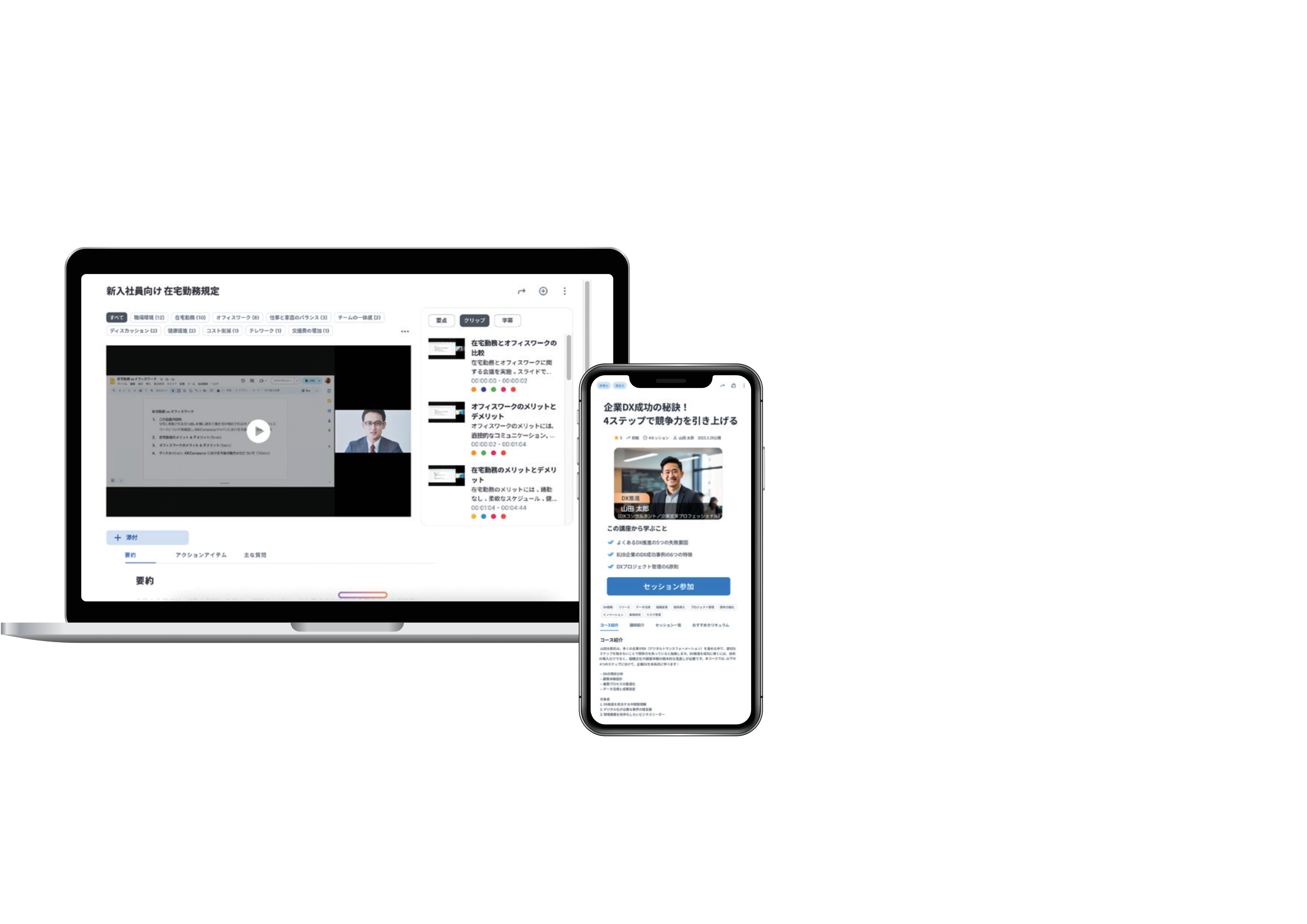 ● 会議録画データをアップロードし、文字起こし、会議要約、自動タグ生成、シーン自動分割が可能。さらに過去の会議含め横断的なAI 検索により、共有・活用することで会議の効率化、生産性の向上、さらには社内に散在している知見のAI による効率的な共有・活用。
