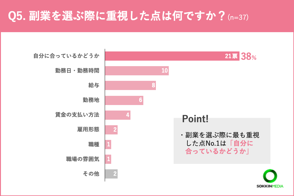 「Q5.副業を選ぶ際に重視した点は何ですか?(複数選択可)」という問いに対して、最も多く挙げられた回答は「自分に合っているかどうか」でした。次いで「勤務日・勤務時間」「給与」という結果となりました。