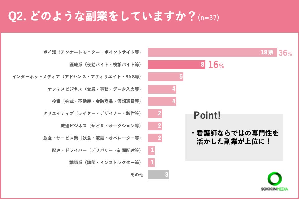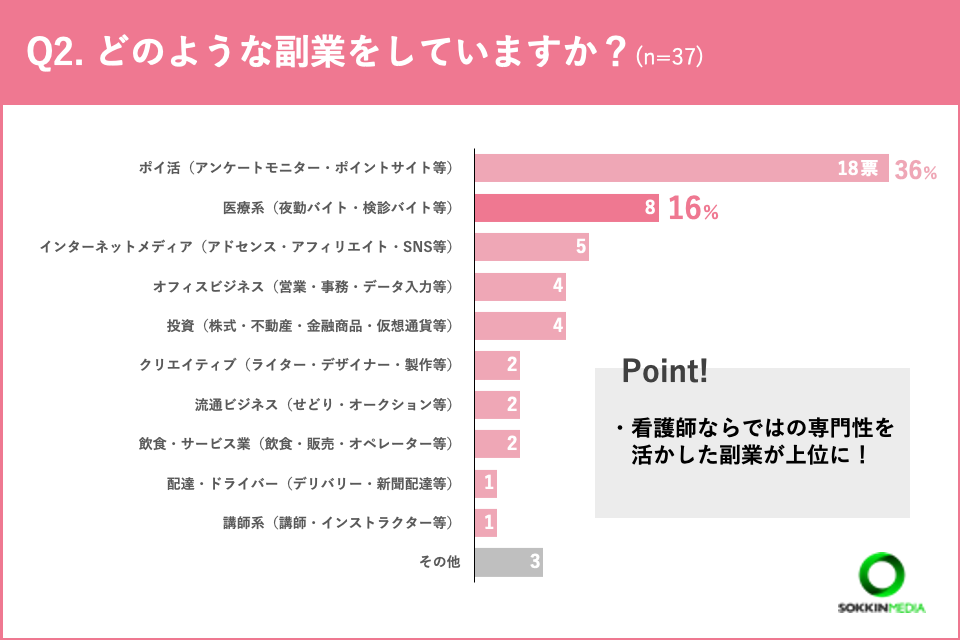 「Q2.どのような副業をしていますか?(複数選択可)」という問いに対して、「ポイ活(アンケートモニター・ポイントサイト等)」と回答した人が最も多く、全体の36%を占めました。次いで「医療系(夜勤バイト・検診バイト等)」が16%となっています。看護師ならではの専門性を活かした副業が第2位という結果になりました。「その他」の回答では、「サロンモデル」と回答した方もいました。