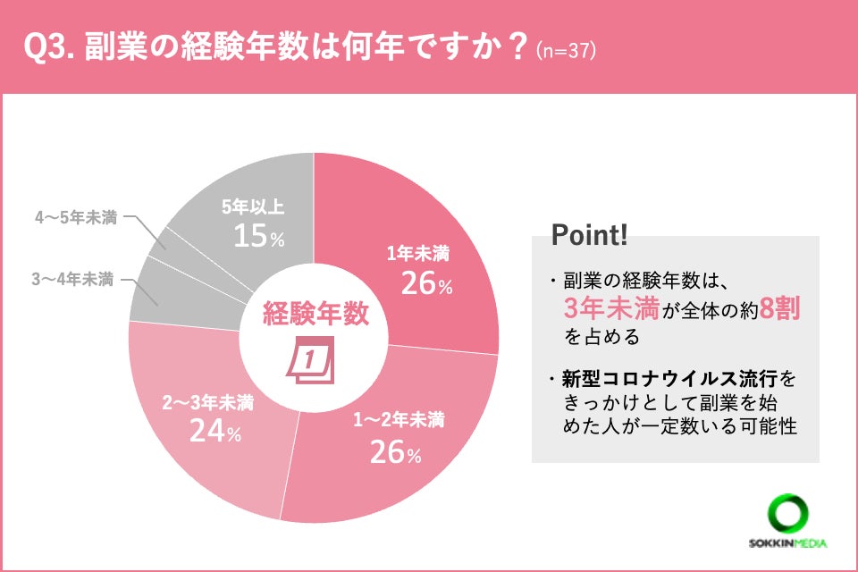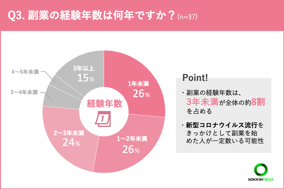 「Q3.副業の経験年数は何年ですか?」という問いに対して、「1年未満」「1〜2年未満」という回答が同率一位となりました。さらに、副業の経験年数が3年未満と答えた方が全体の約8割を占める結果となりました。