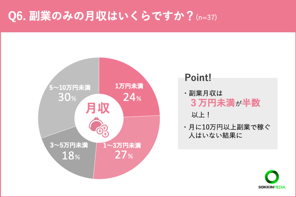 「Q6.副業のみの月収はいくらですか?」という問いに対して、「1万円未満」「1〜3万円未満」と答えた方が最も多く、それぞれ24%という結果になりました。さらに、副業月収が3万円未満である人が半数以上であることがわかりました。