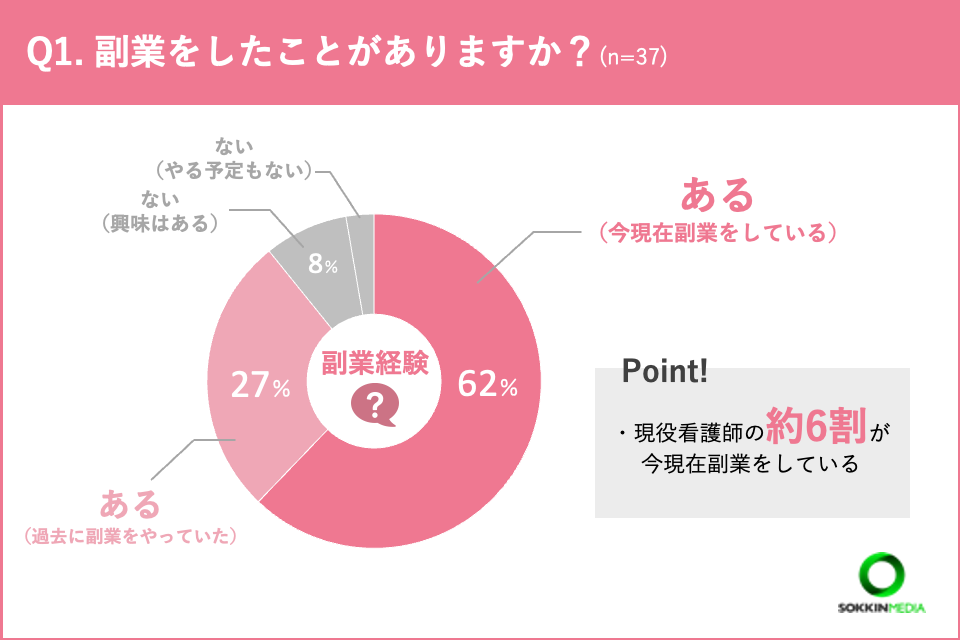 新型コロナウイルス流行をきっかけとして、医療現場における不安感などから、新たな収入源確保のために副業を始めた看護師が一定数いる可能性が考えられます。