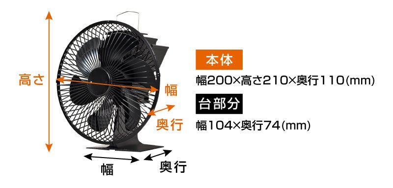 本体サイズ幅200×高さ210×奥行110mm。お手持ちの石油ストーブまたは薪ストーブの天面部に本製品をのせるだけでOK。本体底面部から伝わった熱をエネルギーに変換し、羽根を回転させます。ストーブの熱がファンの風で循環しストーブ付近だけでなく、広い範囲を温めることができます。
