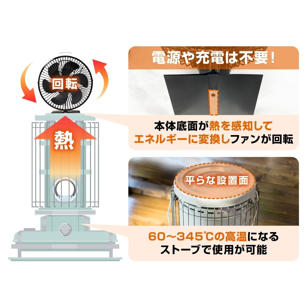 ■電気不要 熱を電気エネルギーに変換し羽根を回転