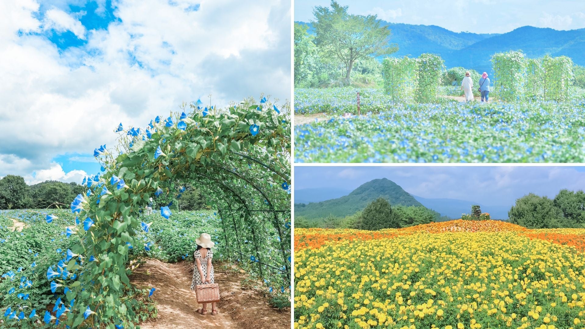 ヘブンリーブルー(西洋アサガオ)とマリーゴールドが丘一面に広がり、夏の世羅高原を爽やかに彩ります。