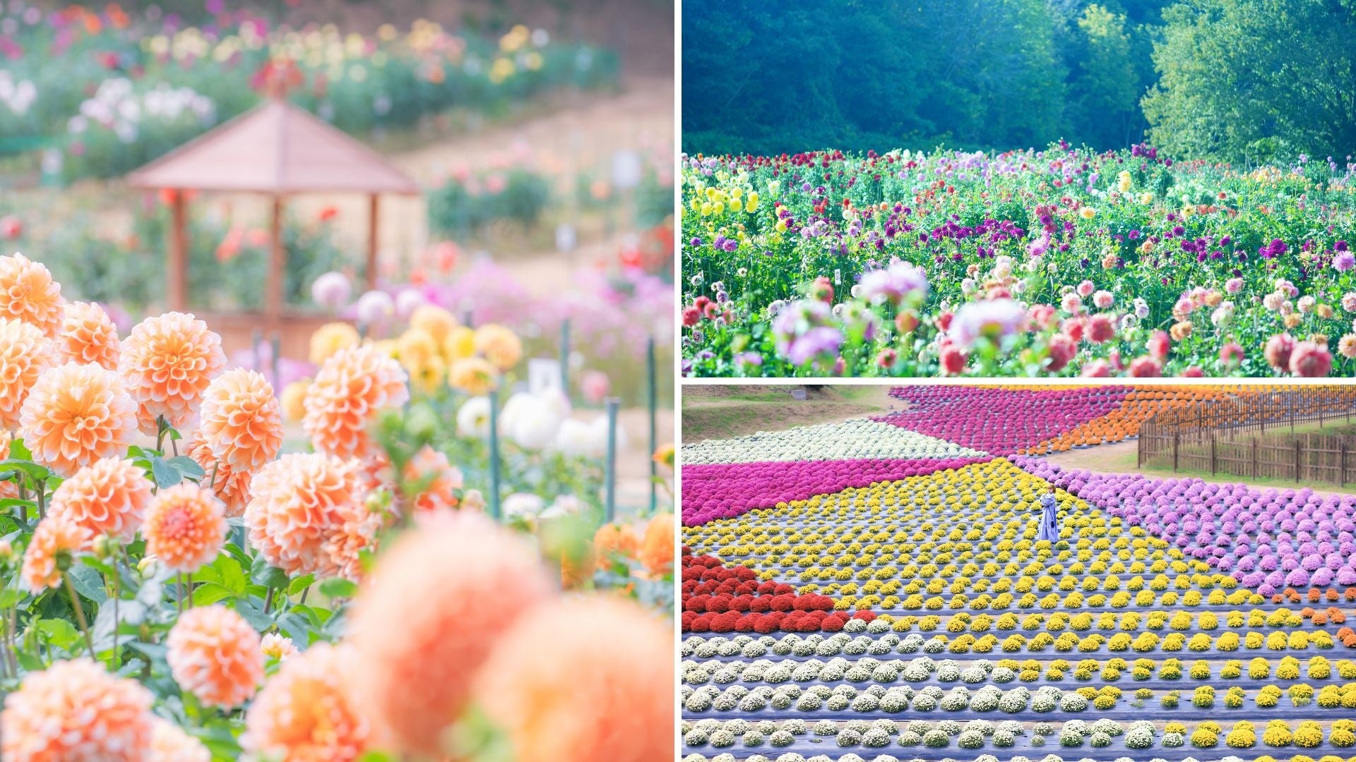 豪華絢爛・多種多様なダリアと色鮮やかで可愛らしい花姿のガーデンマムが秋の世羅高原を彩ります。