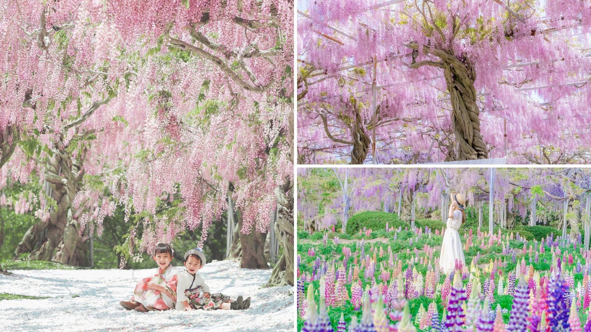 30,000㎡に約1,000本のふじと、昇り藤という別名のあるルピナス12,000株が花開きます。2021年にリニューアルオープンした園内では、約10エリアごとに様々な視点からの藤の魅力をお届けします。薫りの散歩道で心安らぐひとときをお過ごしください。