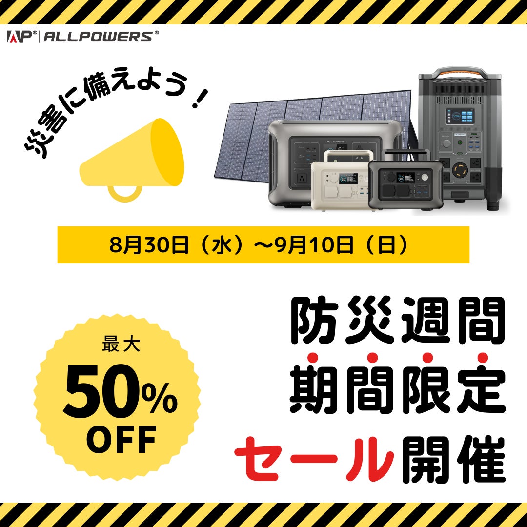 防災週間に向けて特別キャンペーン実施中!ALLPOWERSのポータブル電源とソーラーパネルが最大50%OFF!ポータブル電源でもしもの時に備えよう。