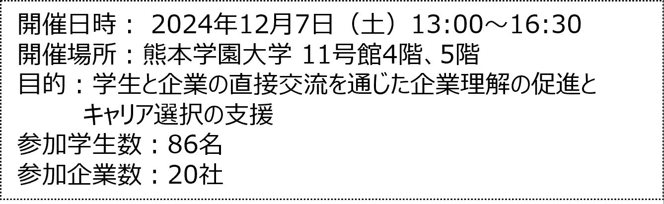 本イベントは、学生が熊本県内の企業をより深く知るきっかけを提供するとともに、企業にとっても次世代を担う若者との接点を生み出す場として企画されました。会場では、職場体験学修(インターンシップ)受け入れ企業を中心に、学生と企業が名刺交換や対話を通じて相互理解を深めることができます。九州ルーテル学院大学では、熊本県内への就職率が約8割と高く、地元志向の学生も多い一方で、企業と直接話す機会が不足している現状があります。